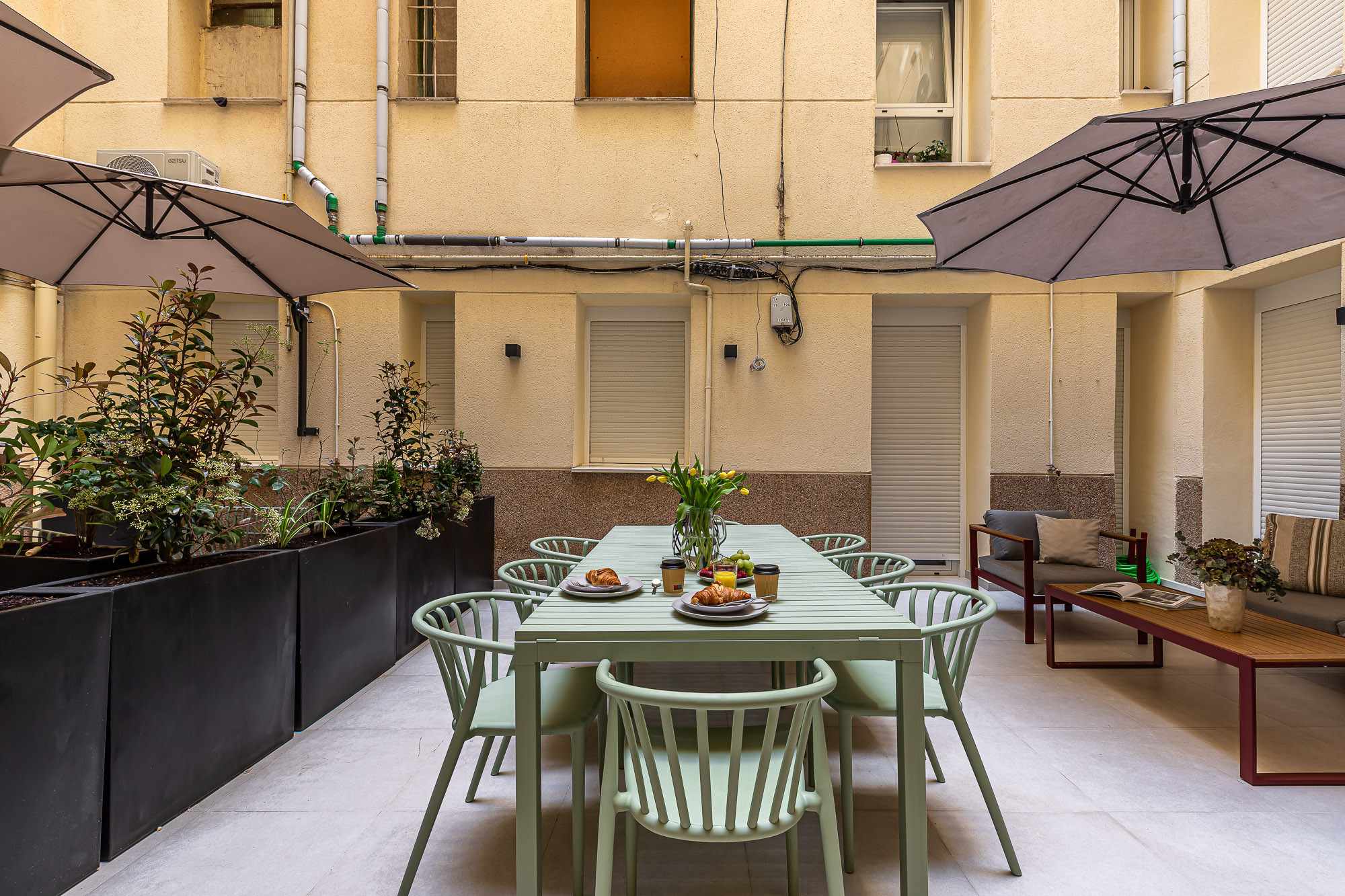 - Y la joya de la corona: una maravillosa terraza, equipada con comedor y salón de exterior, el lugar perfecto para tomar el sol, disfrutar de una comida al aire libre o simplemente desconectar en plena ciudad.