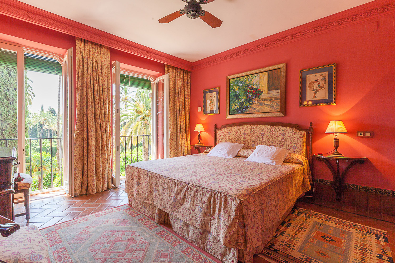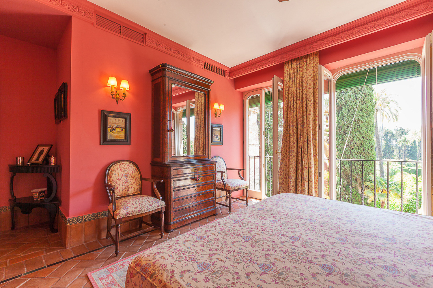 El "Cuarto Rosa" es un espacio luminoso y elegante, donde el encanto clásico sevillano se fusiona con el confort contemporáneo. Sus ventanales se abren directamente hacia los Jardines de los Reales Alcázares, ofreciendo una vista tan cercana que da la sensación de estar dentro de ellos. Un refugio íntimo y sereno, ideal para quienes buscan una experiencia exclusiva en el corazón de Sevilla.