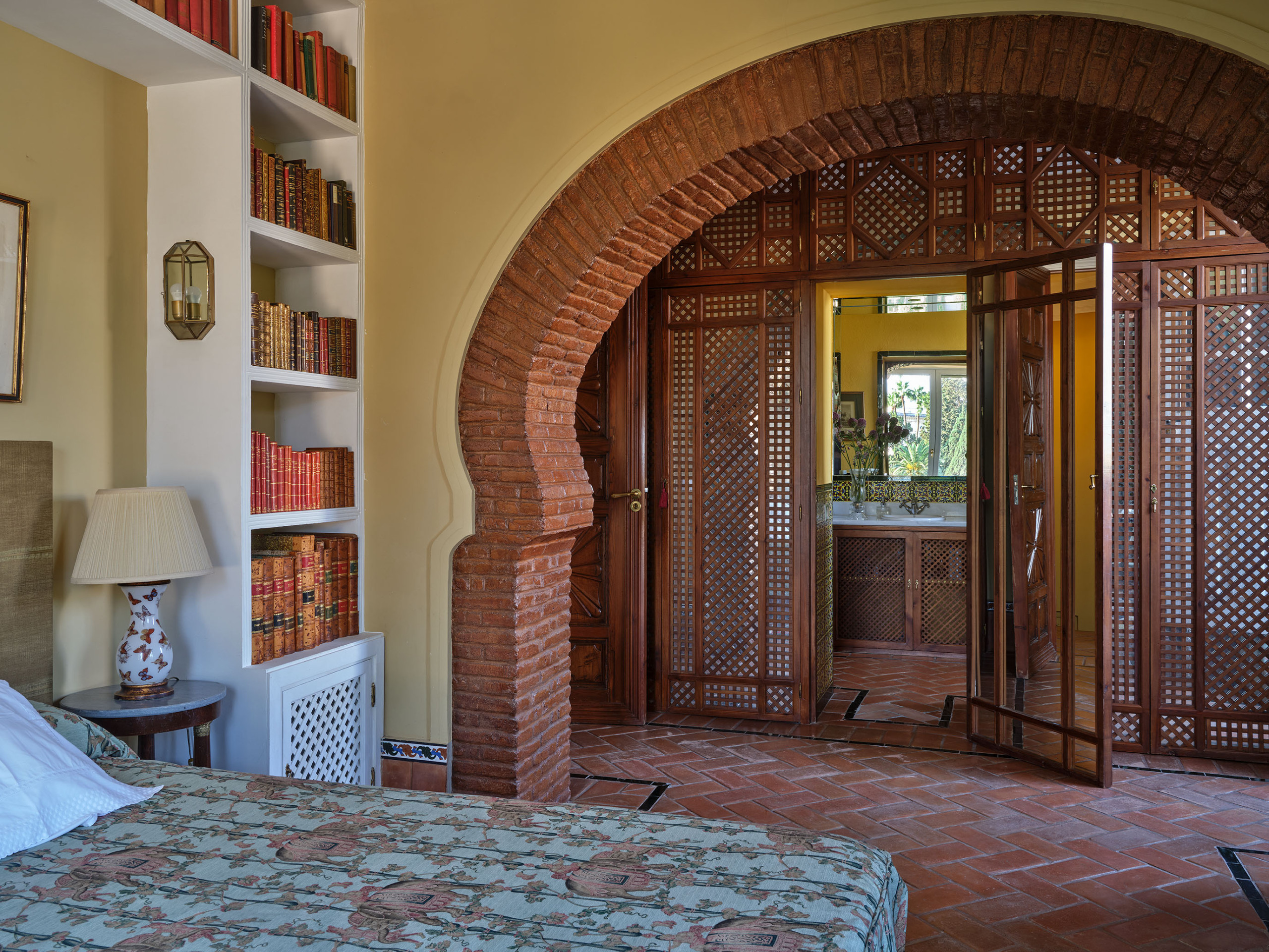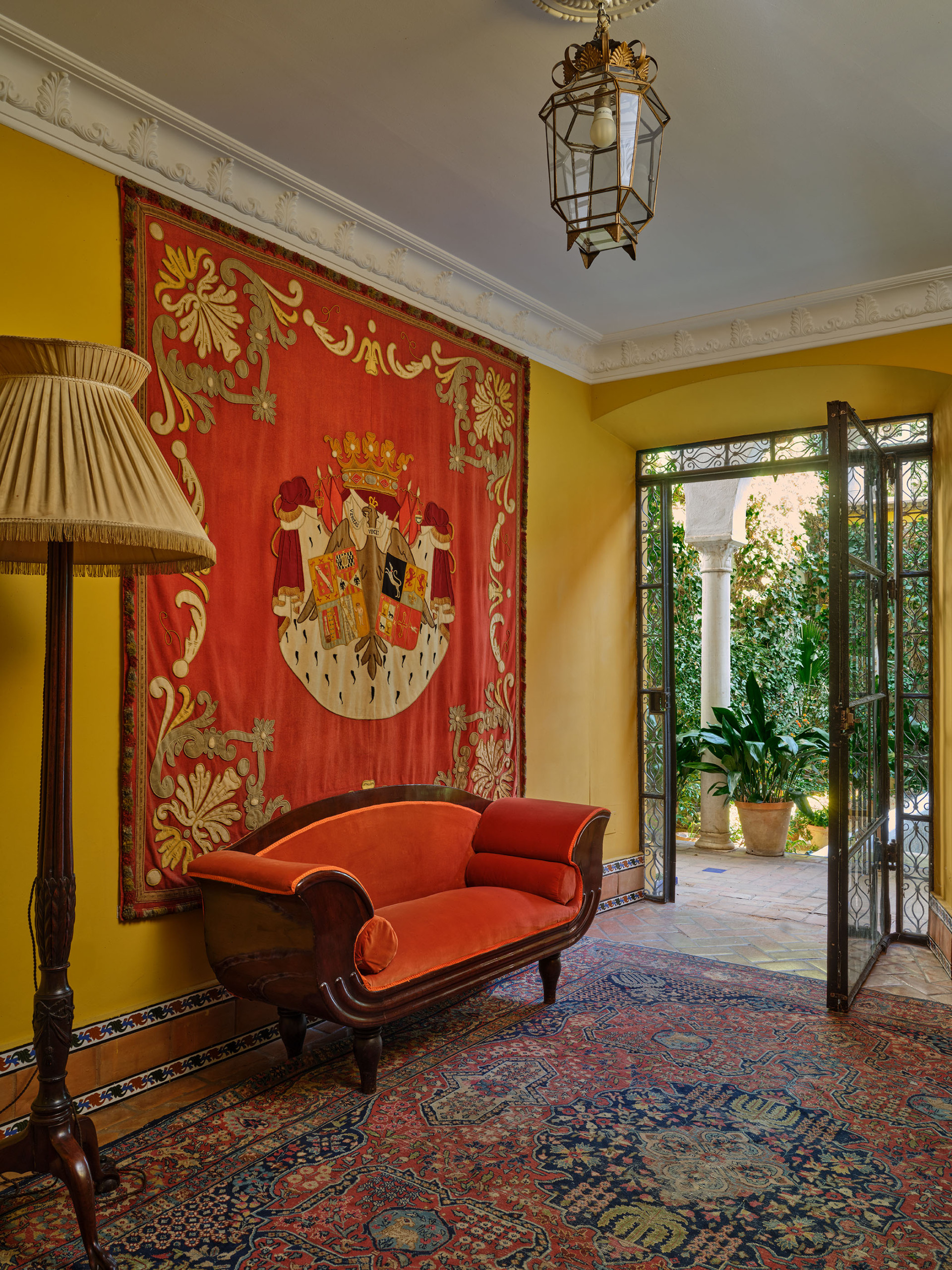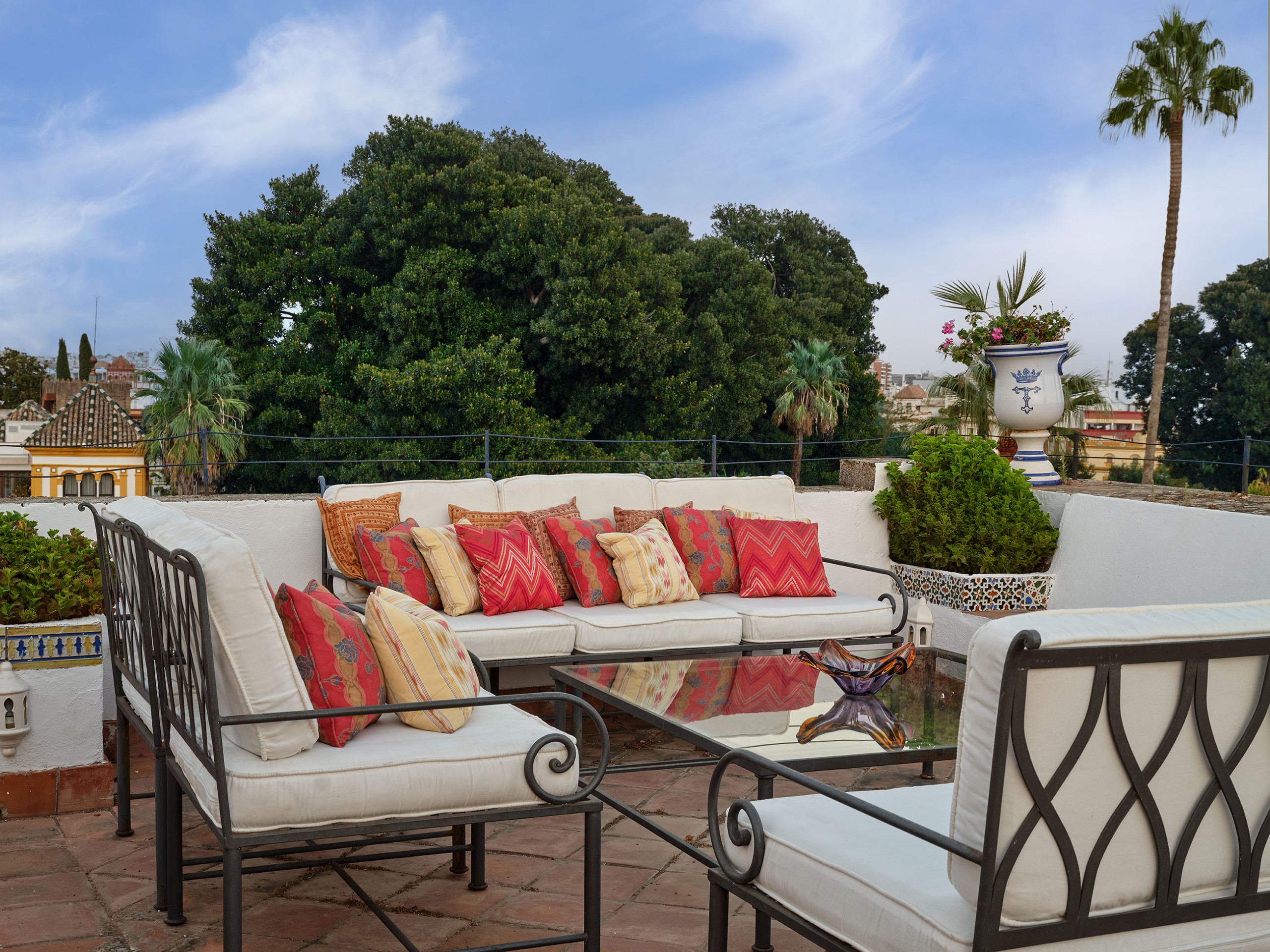 El "Cuarto de la Concha", situado en la tercera planta de la casa-palacio, es un espacio luminoso y elegante, donde el encanto clásico sevillano se une al confort contemporáneo. Su cuidada decoración y su atmósfera serena invitan al descanso y la contemplación. Desde esta habitación se disfruta de una doble perspectiva: el patio andaluz central, un oasis ajardinado de azulejos y una fuente, y los Jardines de los Reales Alcázares, tan próximos que su verdor y su luz parecen colarse en la casa.