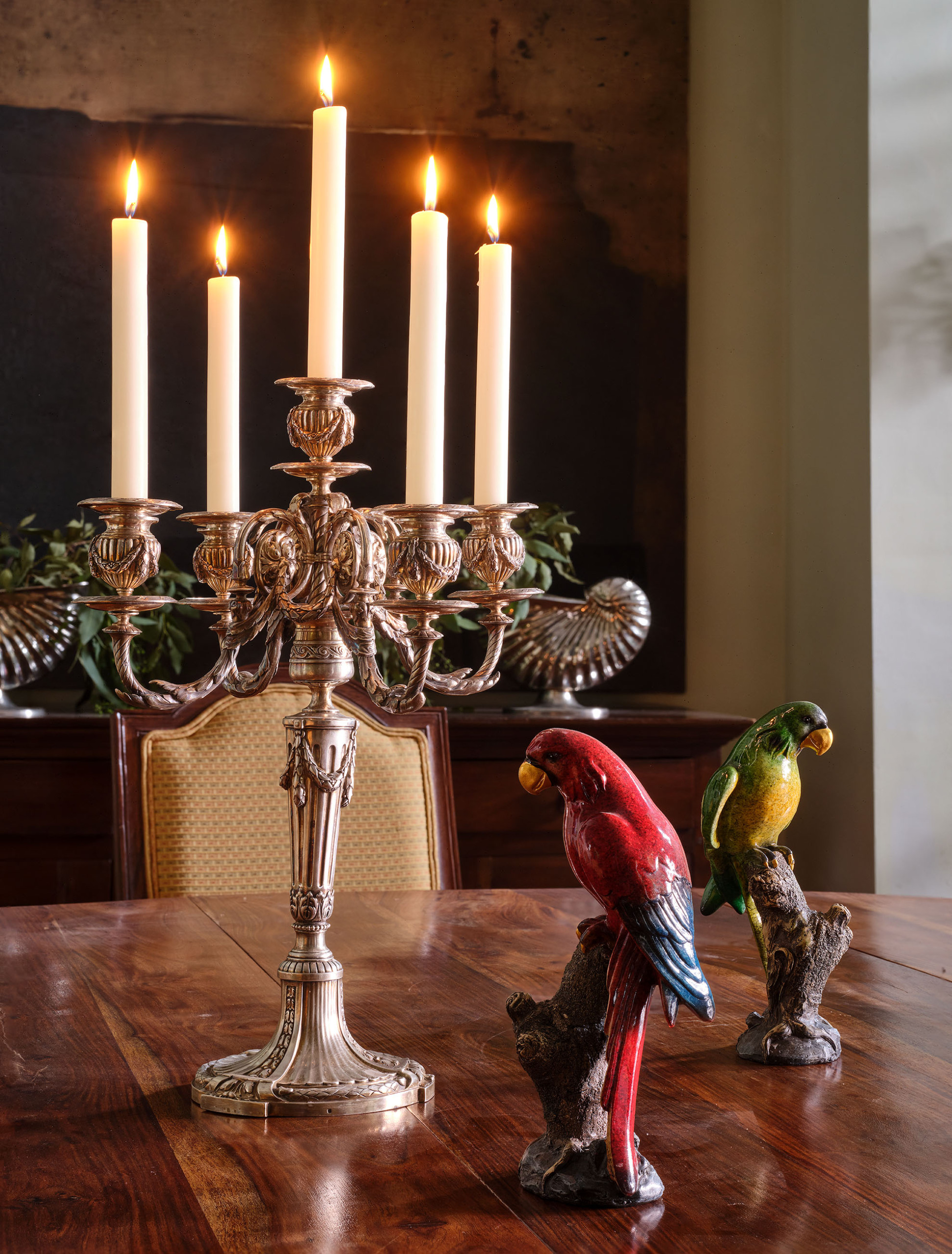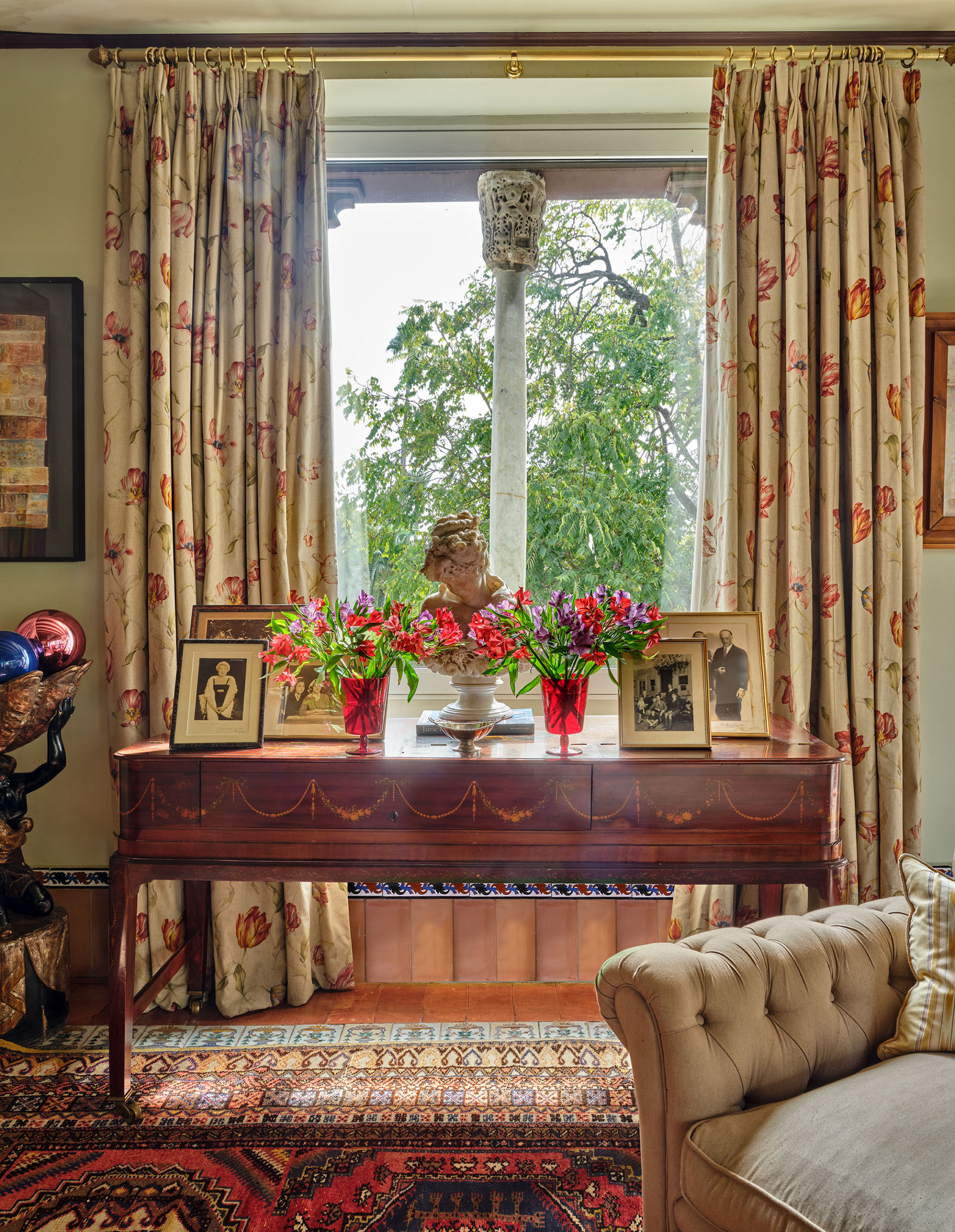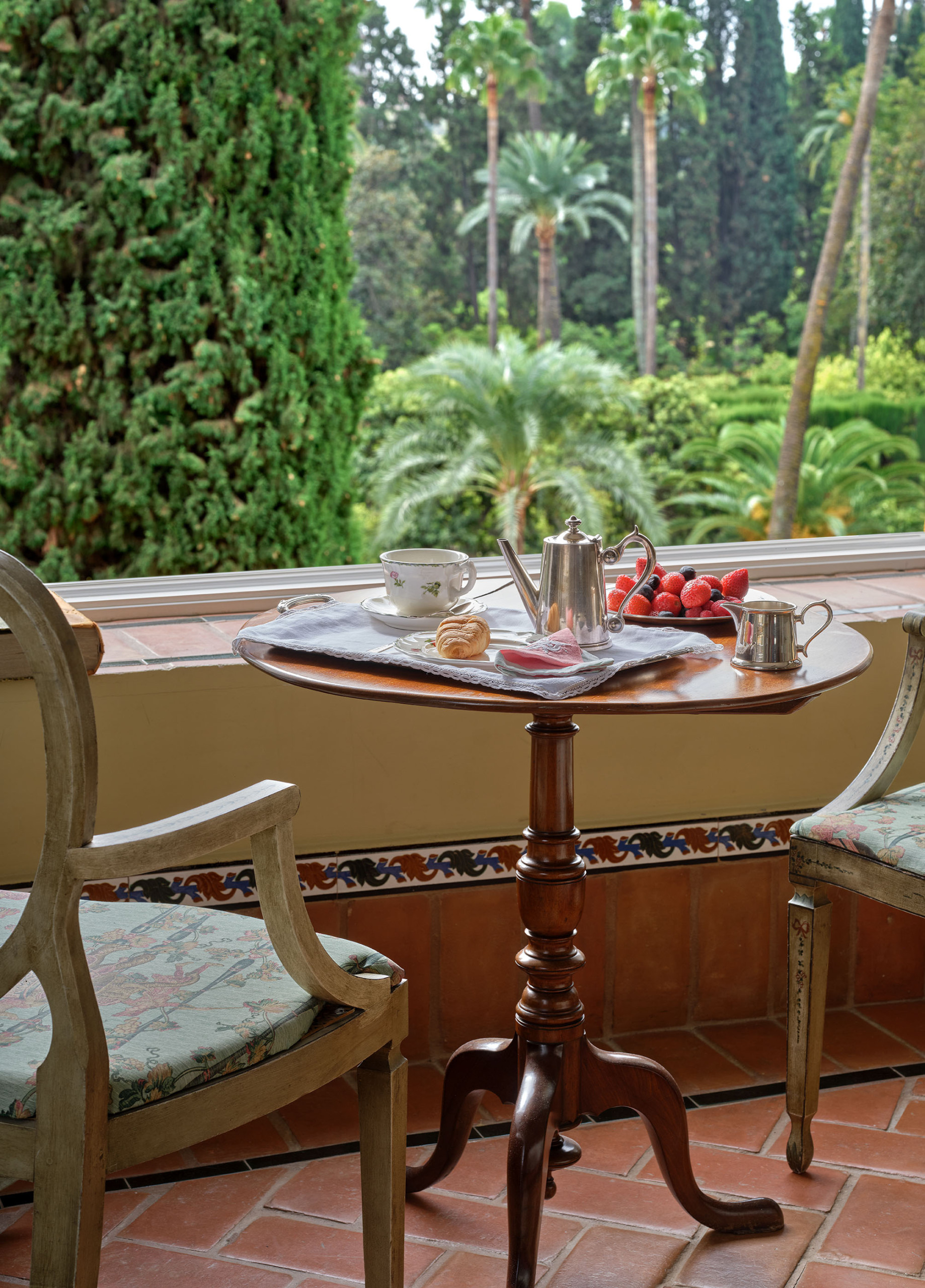 El "Cuarto de la Concha", situado en la tercera planta de la casa-palacio, es un espacio luminoso y elegante, donde el encanto clásico sevillano se une al confort contemporáneo. Su cuidada decoración y su atmósfera serena invitan al descanso y la contemplación. Desde esta habitación se disfruta de una doble perspectiva: el patio andaluz central, un oasis ajardinado de azulejos y una fuente, y los Jardines de los Reales Alcázares, tan próximos que su verdor y su luz parecen colarse en la casa.