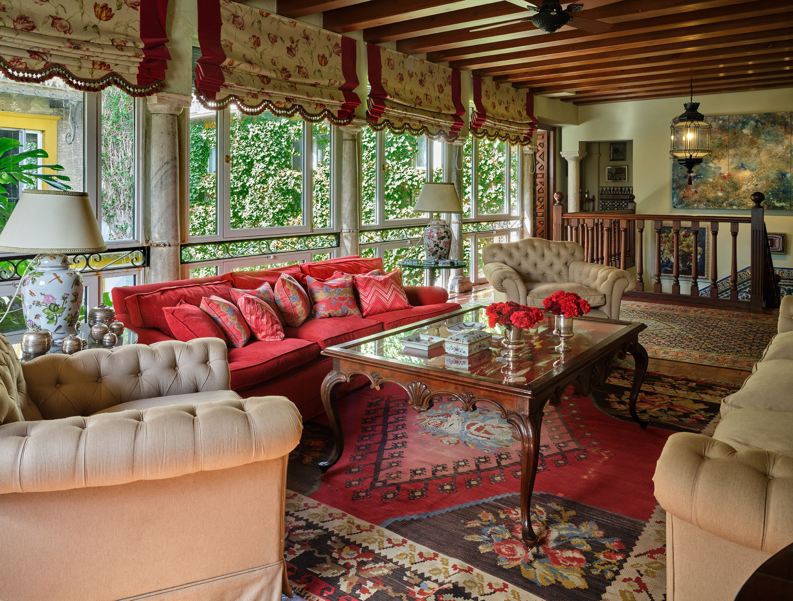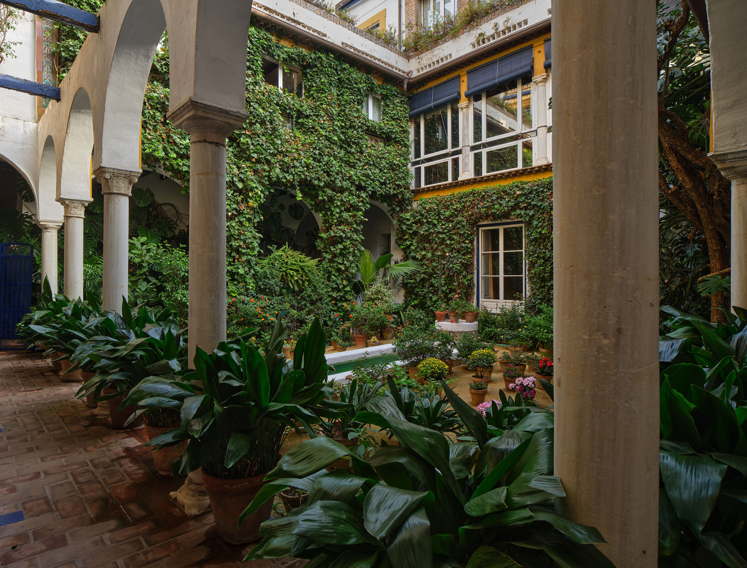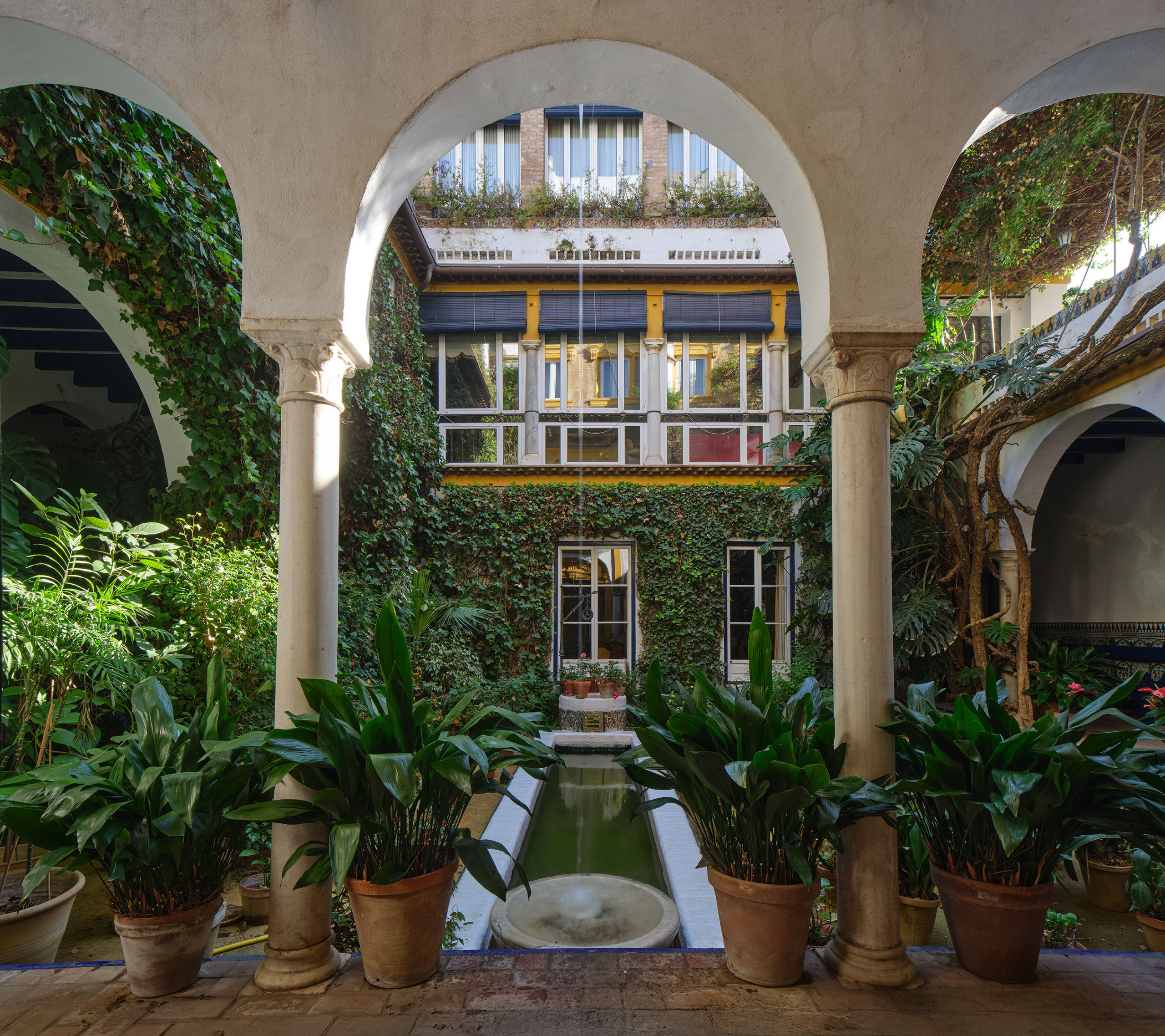Las habitaciones presentan distintos escenarios: Algunas se abren al patio andaluz ajardinado, varias con balcón; otras miran a la muralla de los Reales Alcázares, y algunas disfrutan de vistas a los Jardines del Alcázar, tan cercanos que su luz y verdor parecen entrar en la casa.