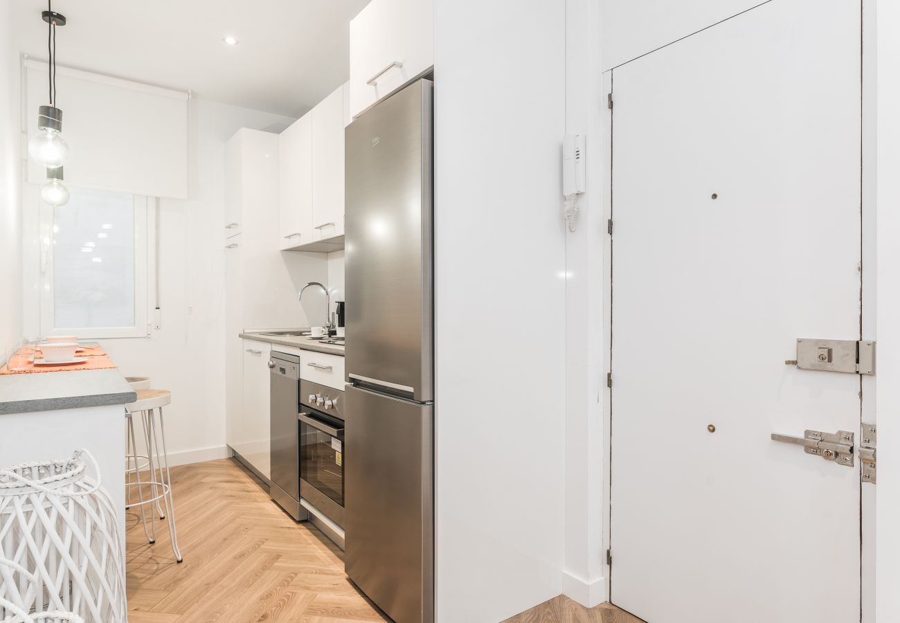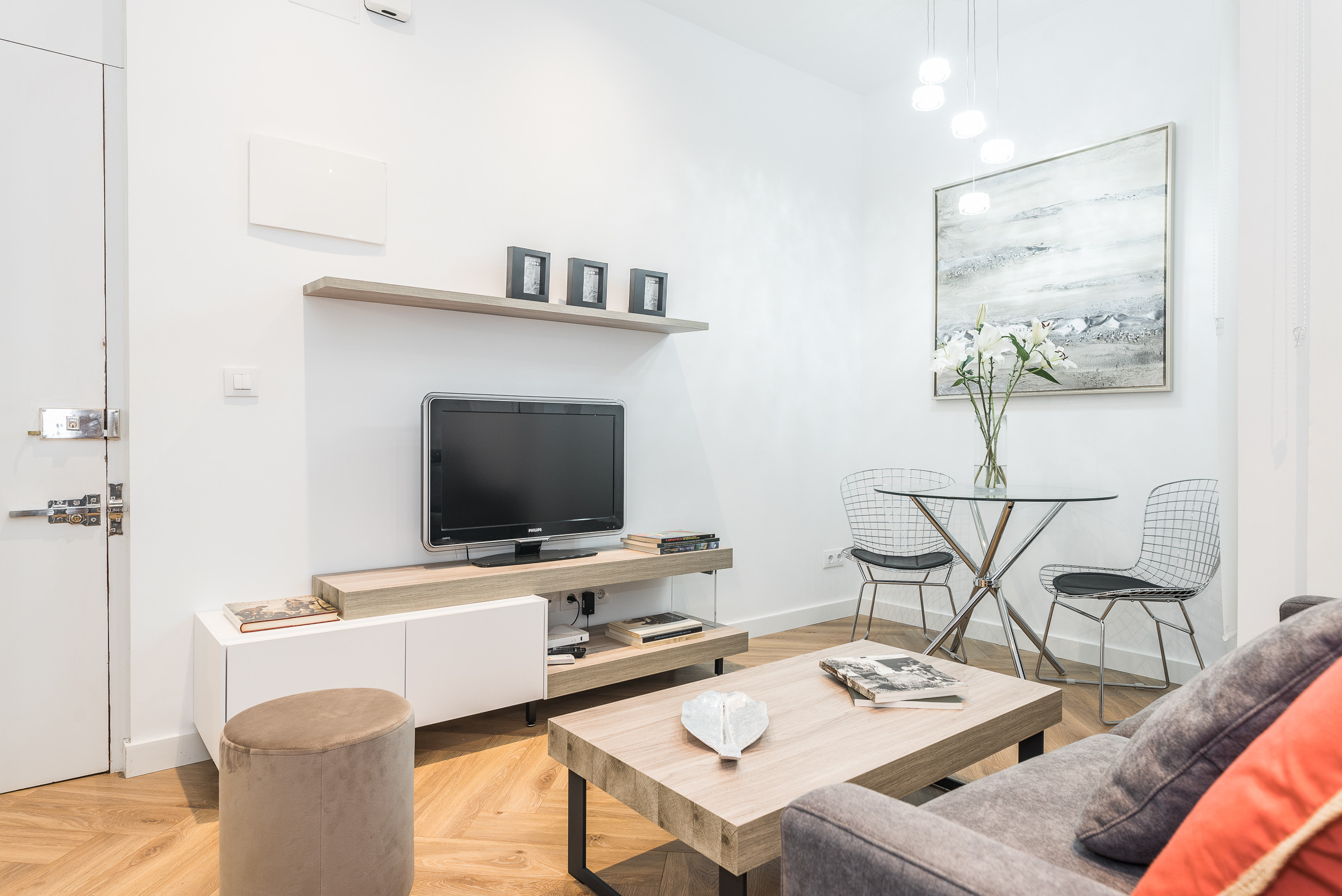 Estupendo apartamento moderno y completamente recién reformado situado en pleno centro de Madrid, pegado a los barrios de Malasaña y Chueca. Decorado elegantemente y totalmente equipado para que su estancia en la ciudad sea un éxito. Cuenta con salón con cocina americana, 1 habitación doble con cama de 135, cocina completamente equipada y 1 baño. SILENCIOSO.