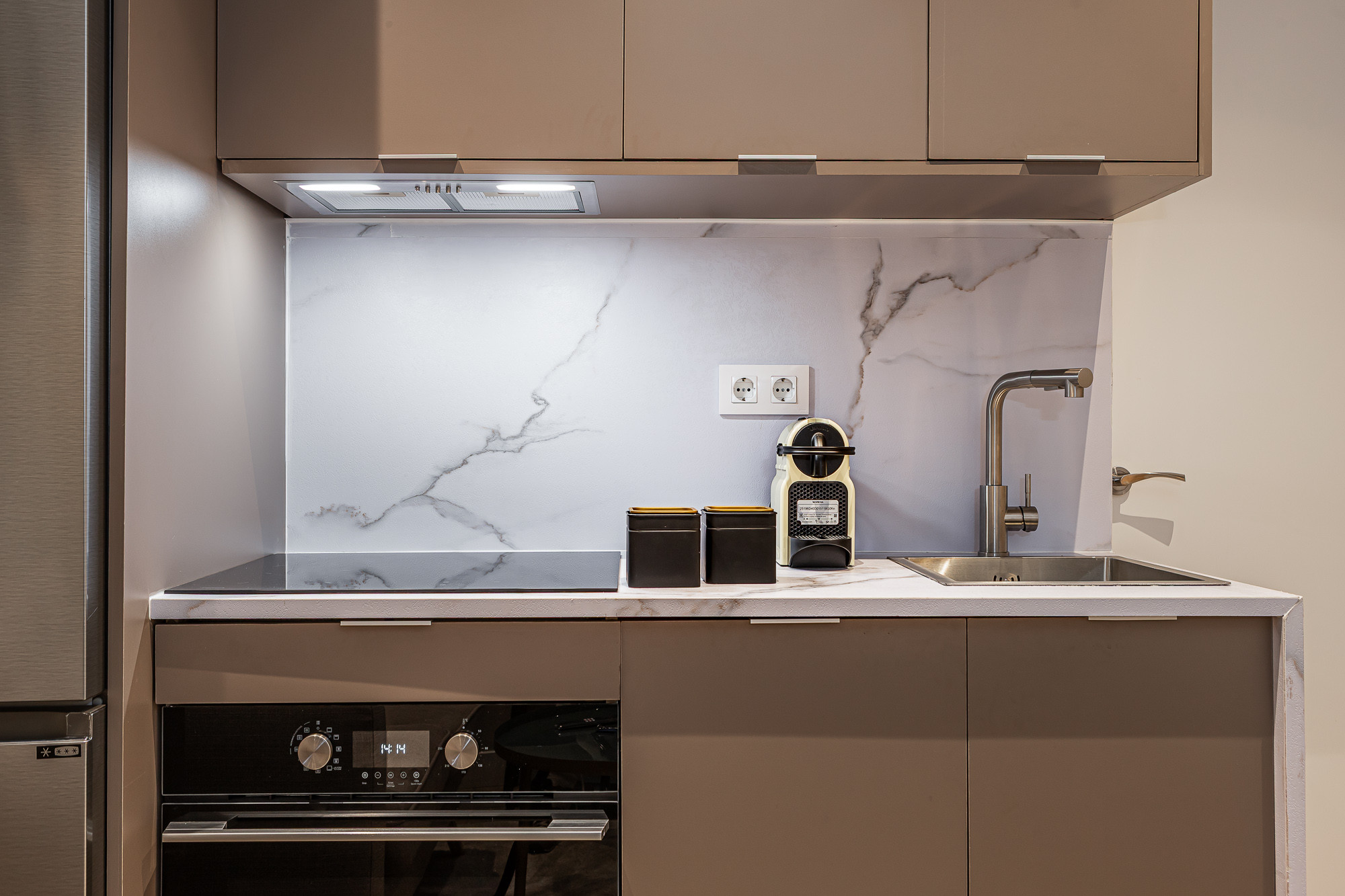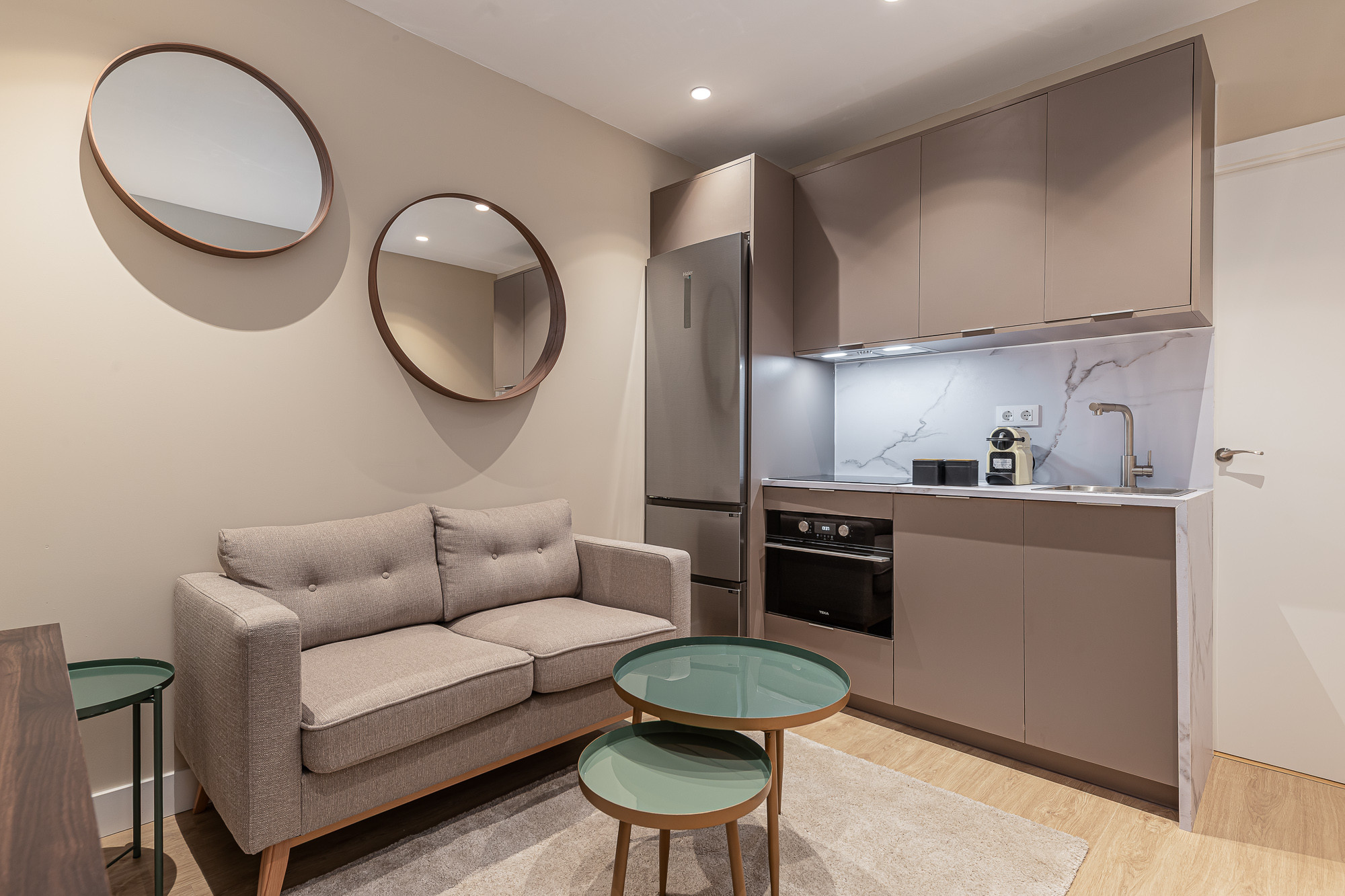 El apartamento cuenta con una moderna cocina americana completamente equipada, ideal para preparar desayunos rápidos o cenas íntimas. Encontrarás electrodomésticos de última generación como lavadora, secadora, lavavajillas, horno, microondas, cafetera, tostadora y una variedad de utensilios de cocina para tu comodidad.