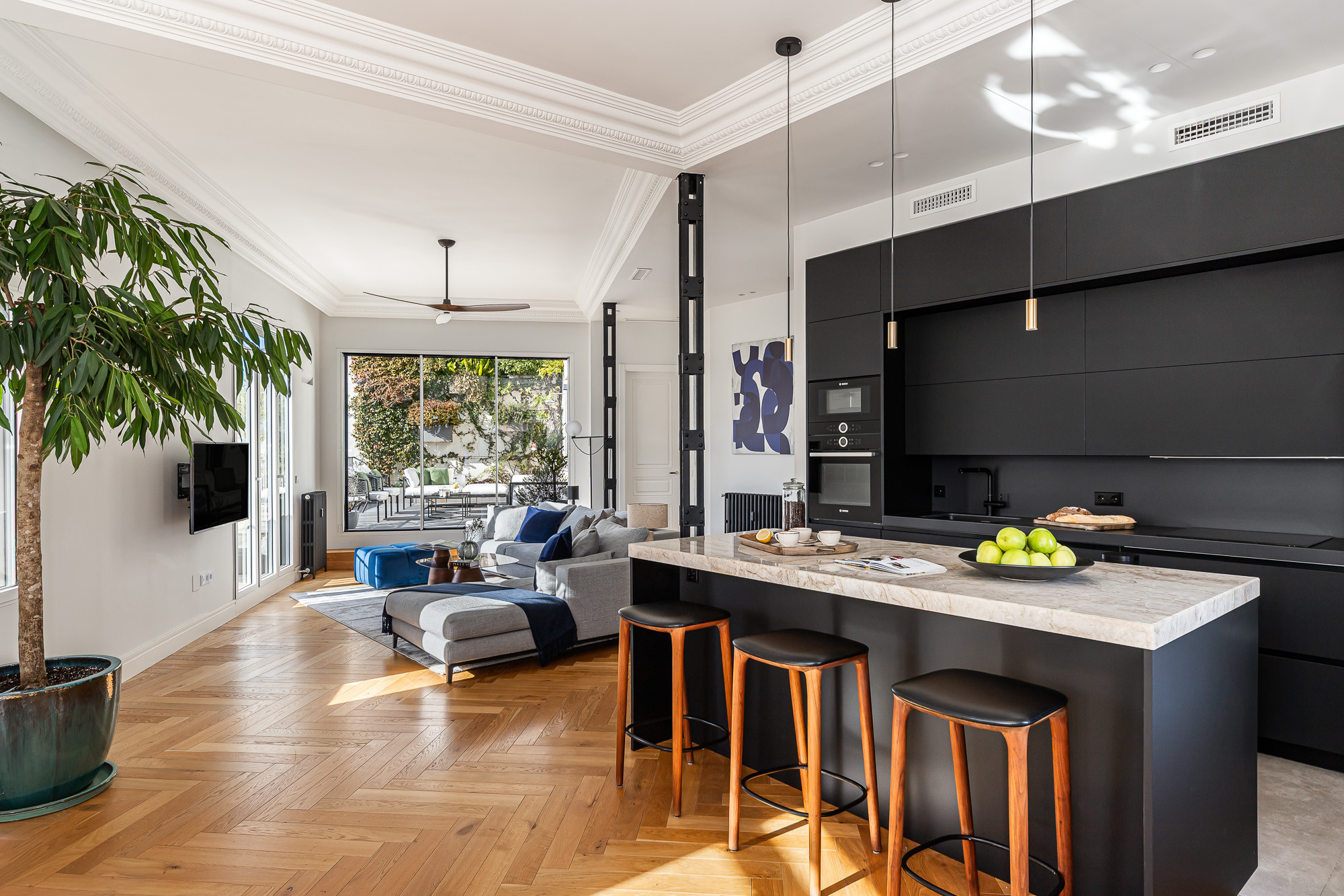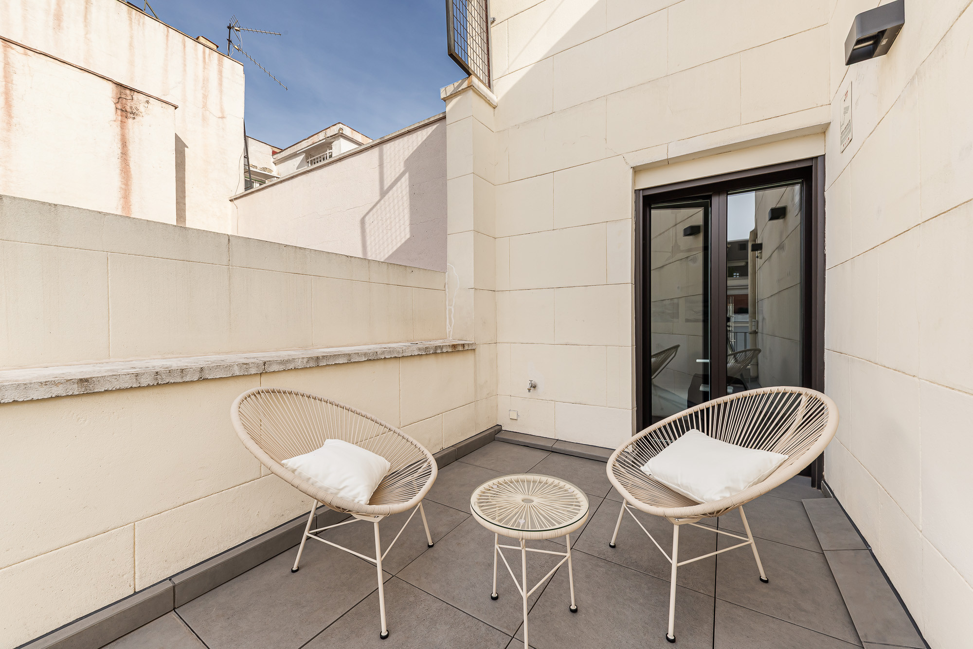El corazón de la vivienda es un acogedor y amplio espacio abierto de salón–comedor–cocina, que se abre directamente a la terraza principal de 40 m² (430 sq ft), orientada al sur y con vistas a la Gran Vía. Es perfecta para desayunar al aire libre, tomar algo mientras contemplas el atardecer o simplemente relajarte mientras absorbes la vibrante energía de la Gran Vía desde las alturas.
