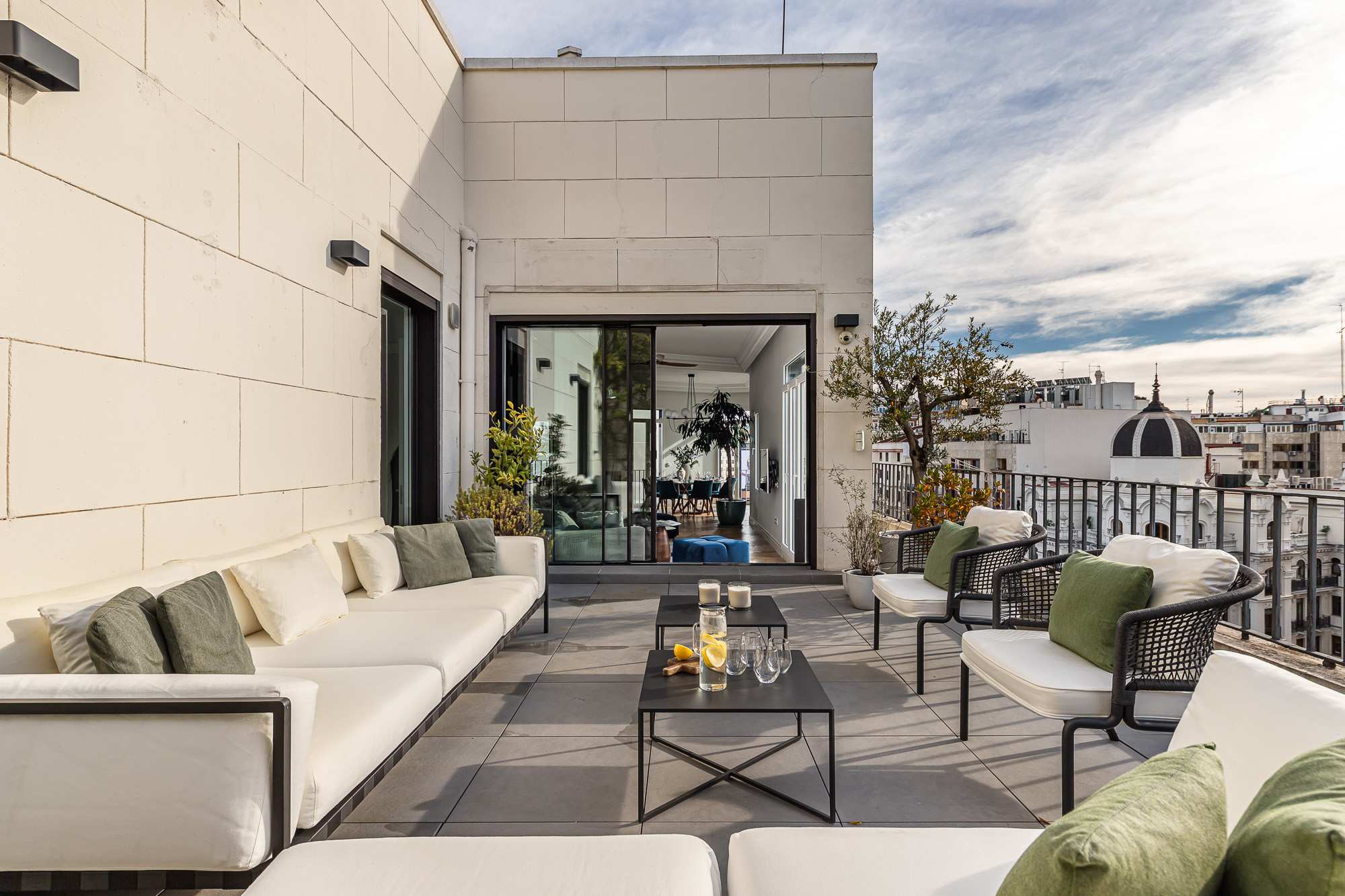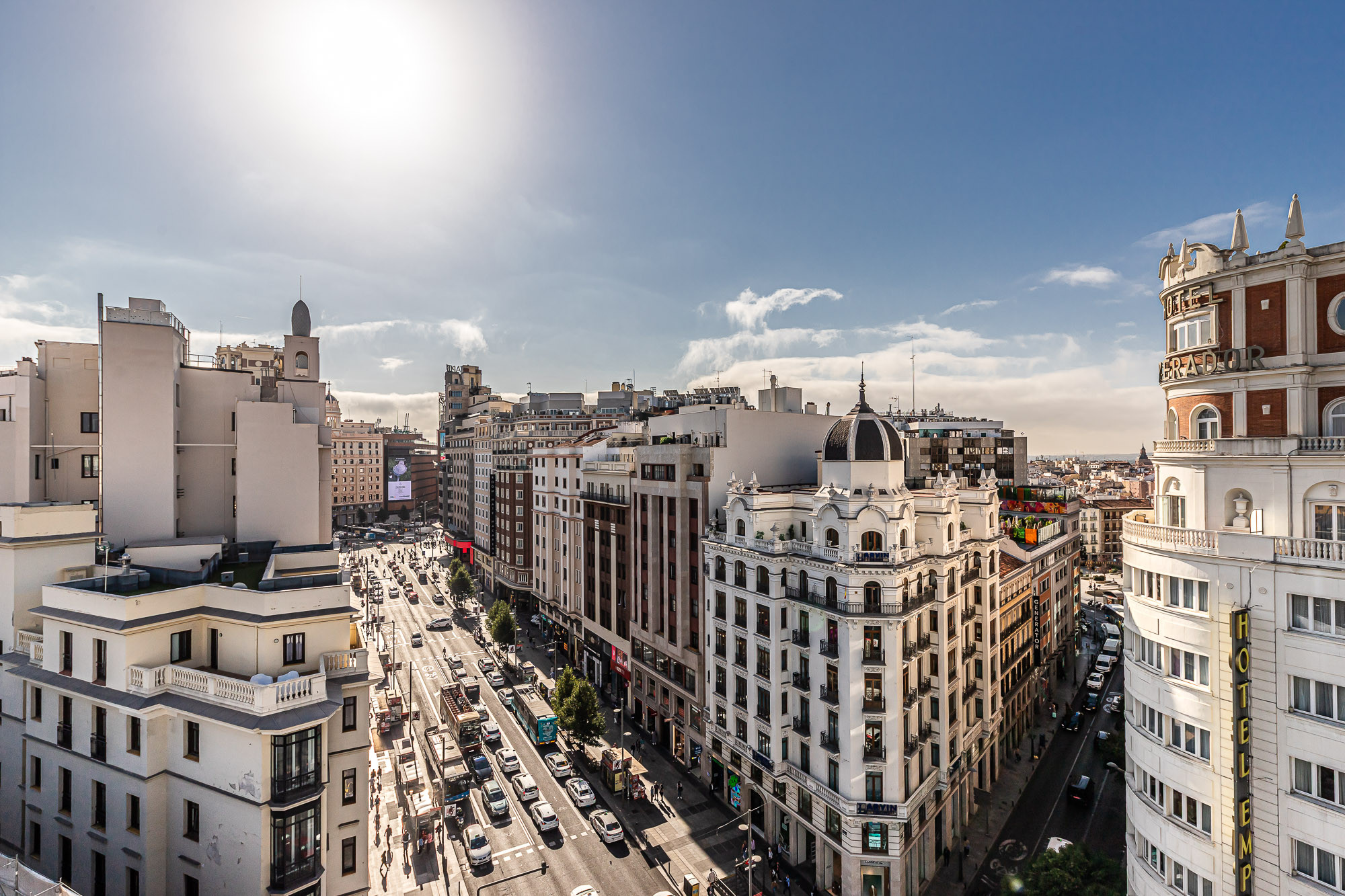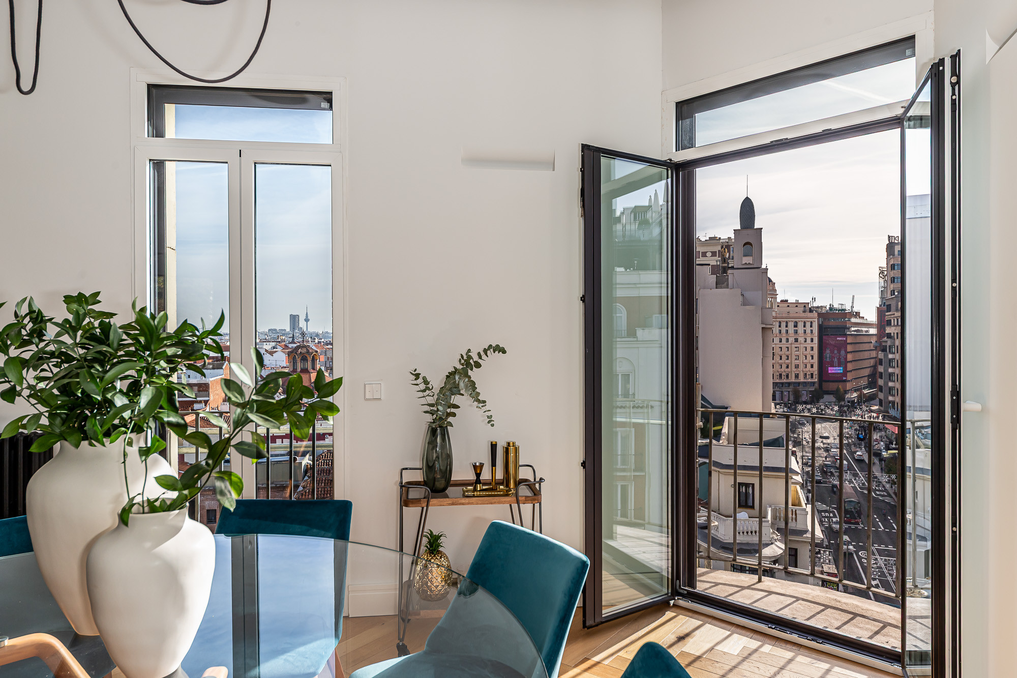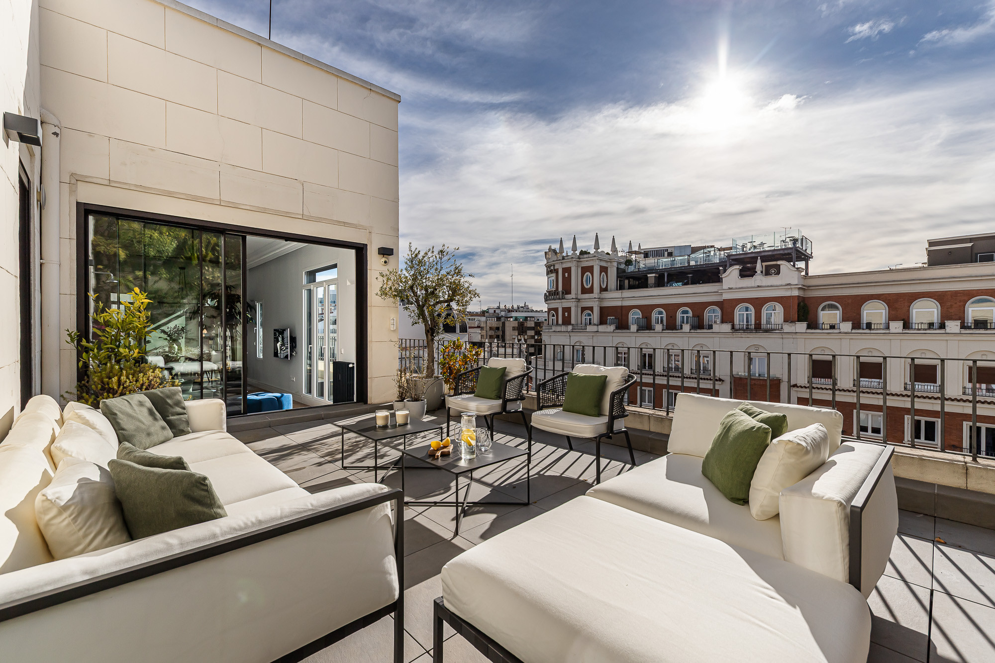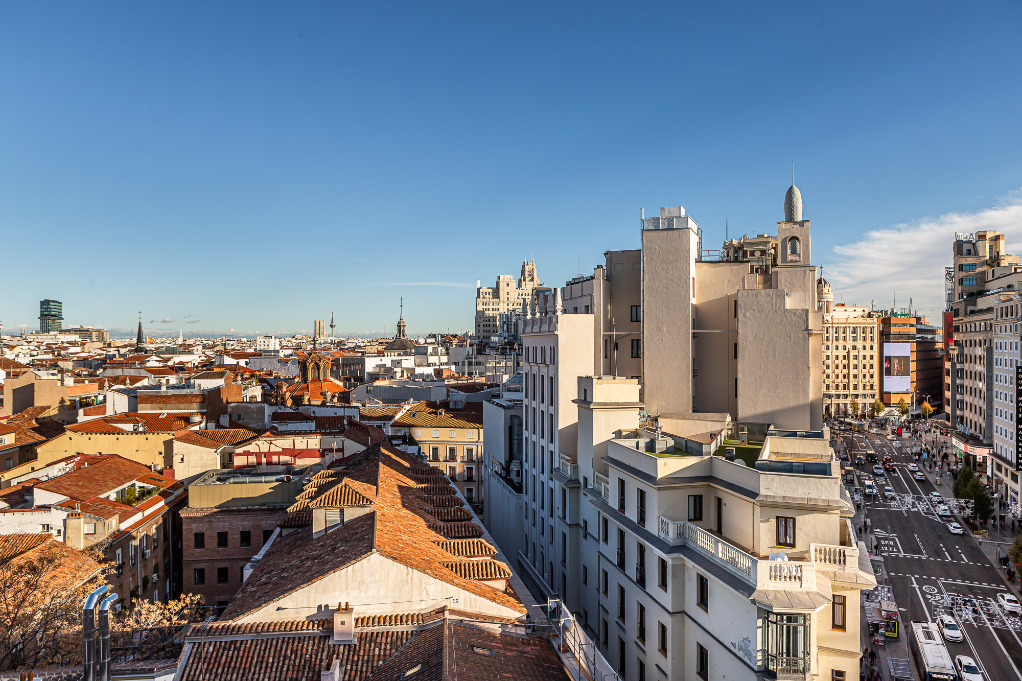 Ático de lujo de 250 m² (2700 sq ft), última planta, ubicado en la calle más emblemática de Madrid, la «Gran Vía». Dispone de 2 terrazas privadas, 6 balcones y unas impresionantes vistas panorámicas de 360 grados sobre toda la ciudad: desde los rascacielos del distrito financiero al norte, atravesando prácticamente toda la Gran Vía, hasta llegar a las montañas del sur. Además, cuenta con un amplio espacio diáfano de salón–comedor–cocina, 4 generosos dormitorios y 3 baños completos.