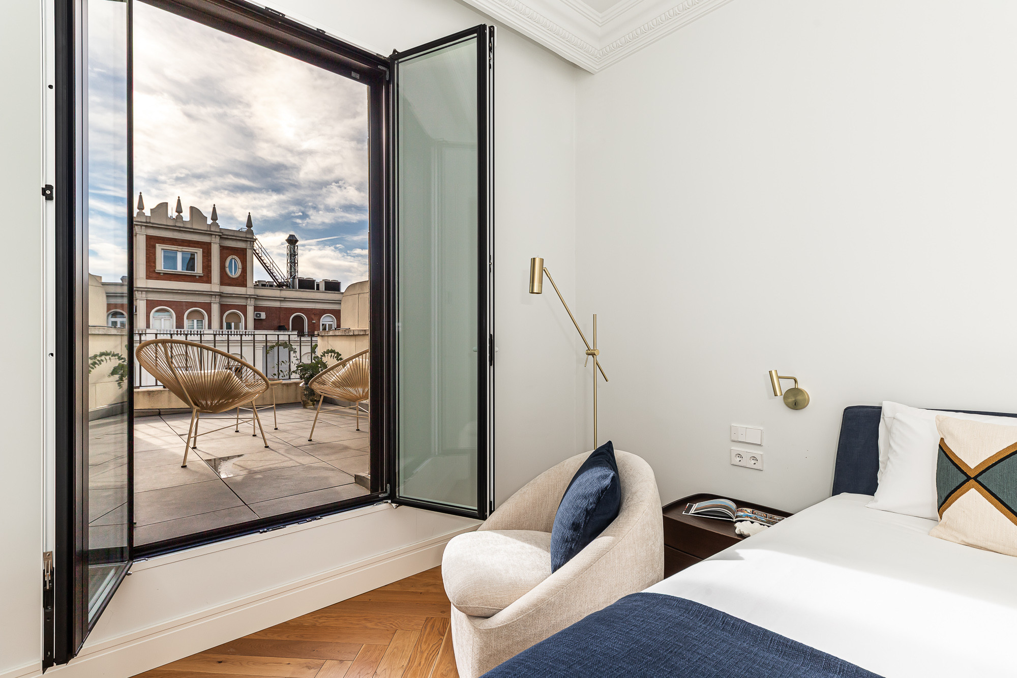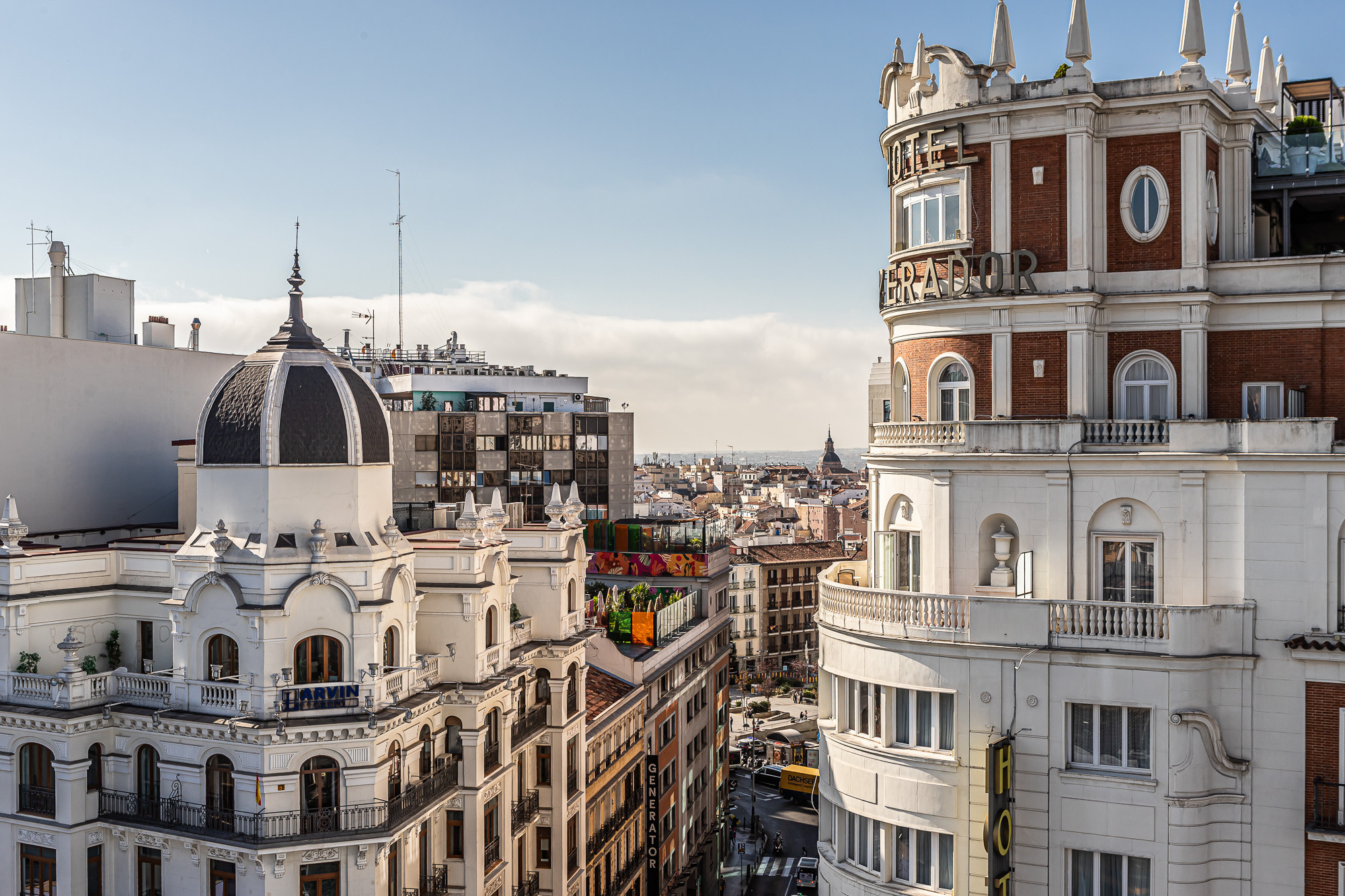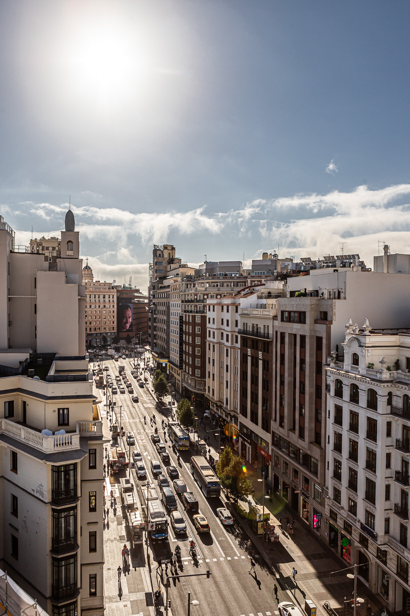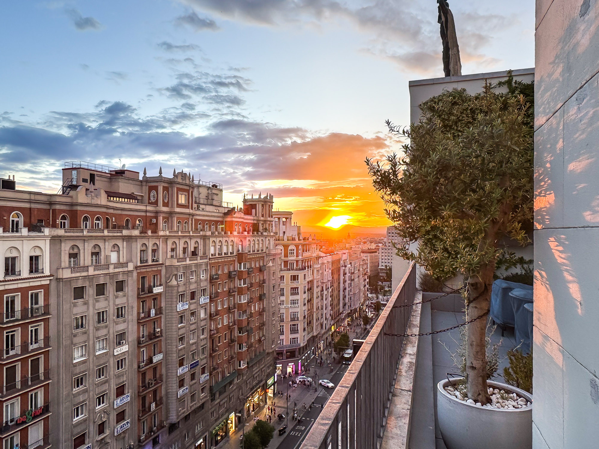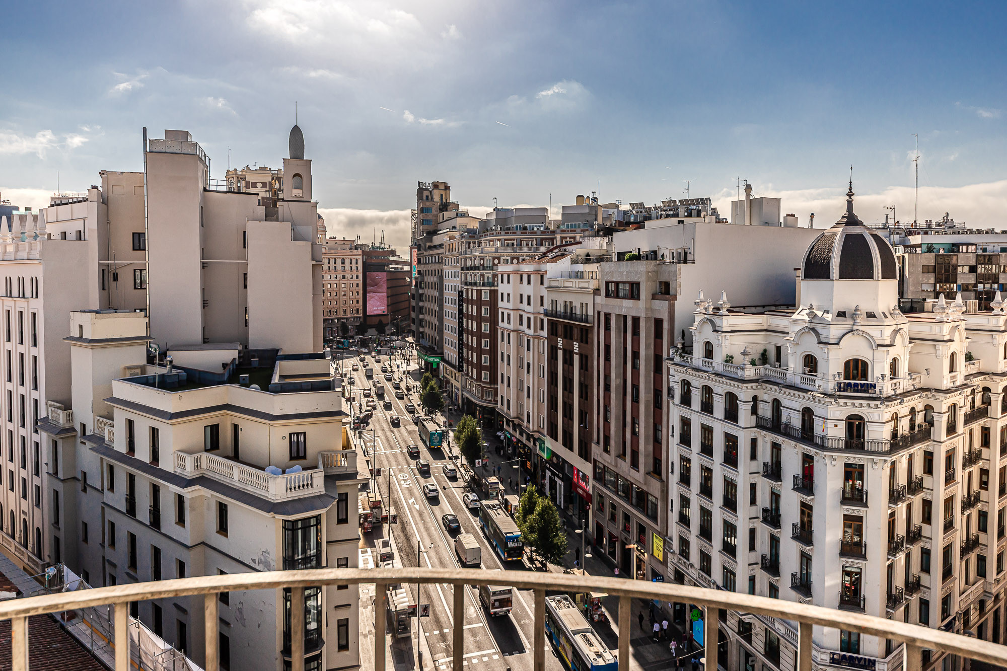 Ático de lujo de 250 m² (2700 sq ft), última planta, ubicado en la calle más emblemática de Madrid, la «Gran Vía». Dispone de 2 terrazas privadas, 6 balcones y unas impresionantes vistas panorámicas de 360 grados sobre toda la ciudad: desde los rascacielos del distrito financiero al norte, atravesando prácticamente toda la Gran Vía, hasta llegar a las montañas del sur. Además, cuenta con un amplio espacio diáfano de salón–comedor–cocina, 4 generosos dormitorios y 3 baños completos.