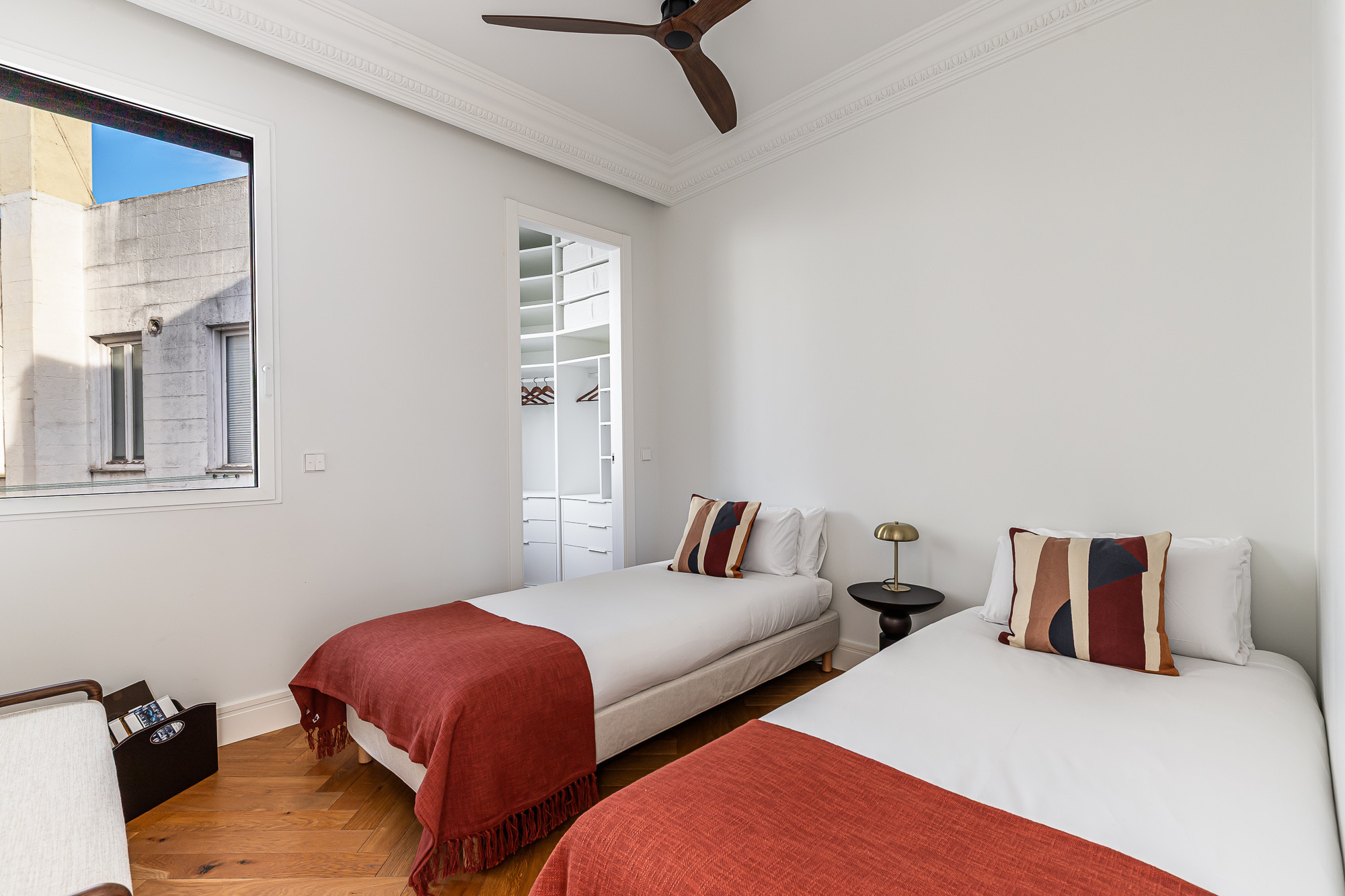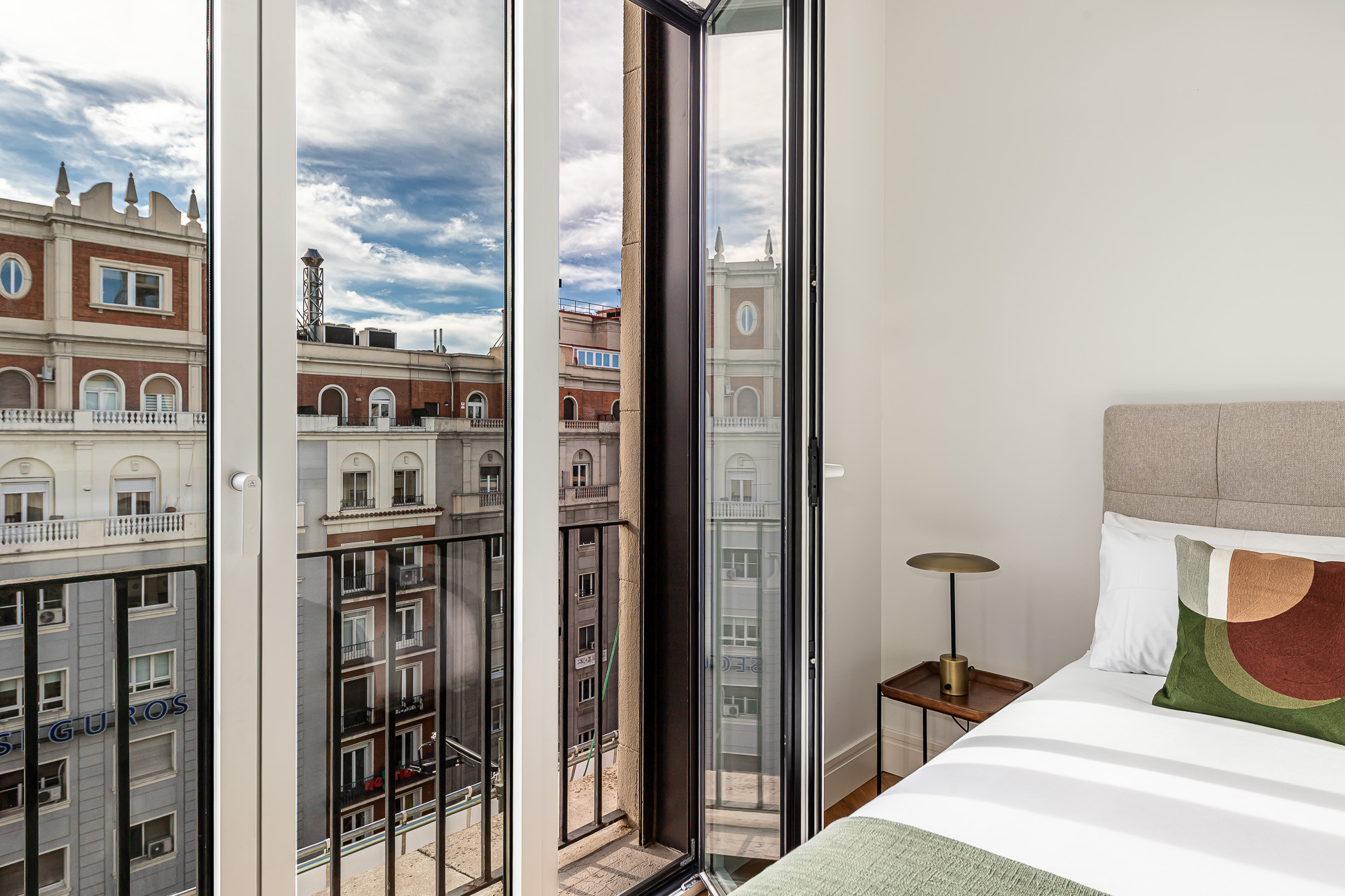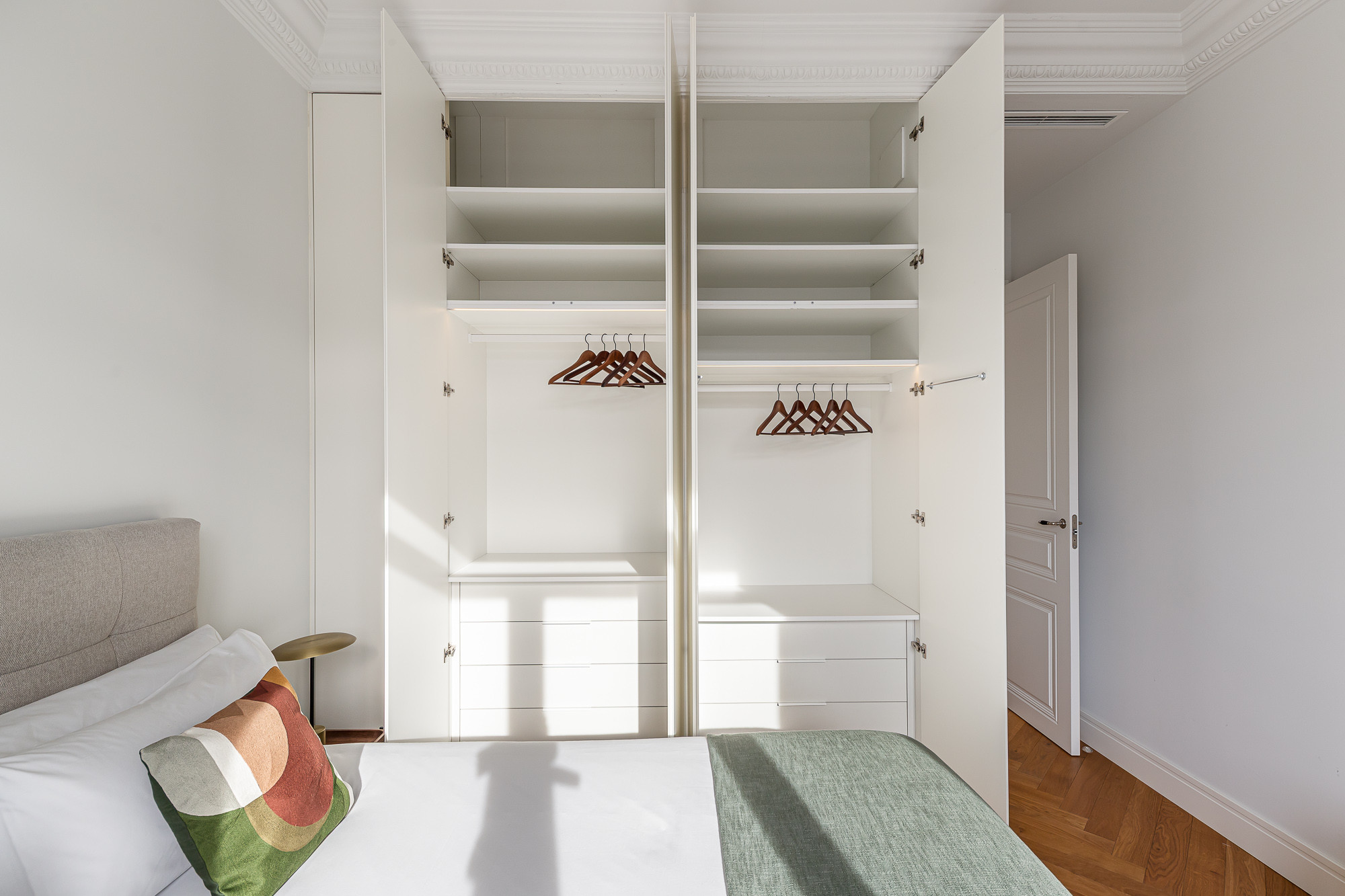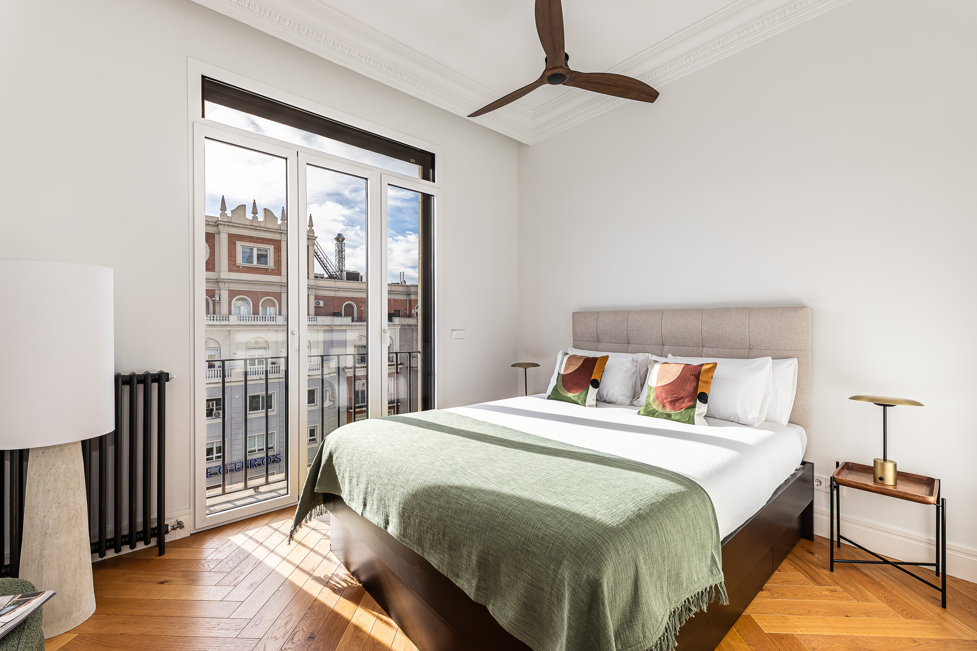 - Dormitorio nº 2 con cama XXL, amplio espacio de armarios y un balcón tipo julieta que da directamente a la Gran Vía