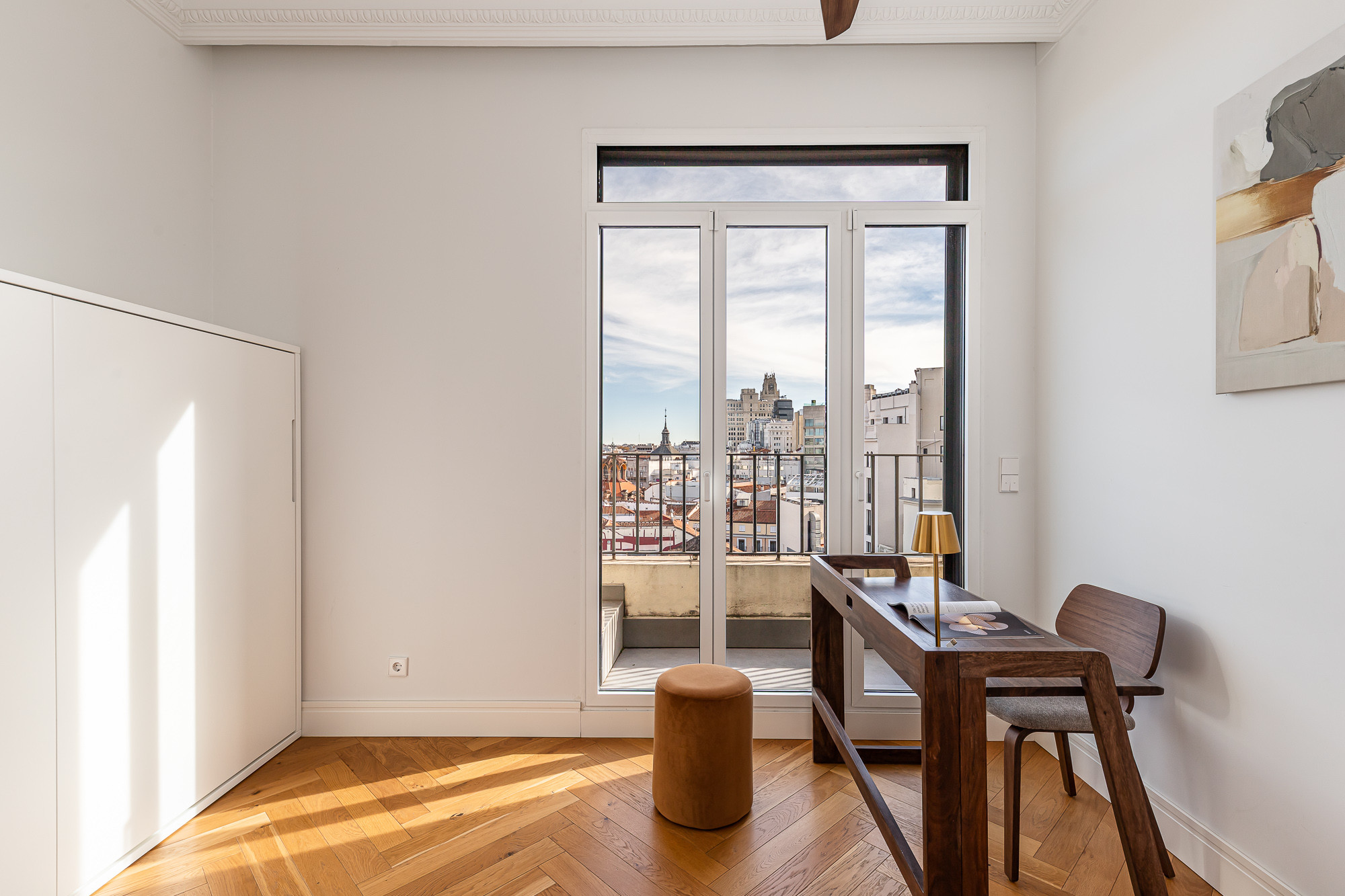 - Dormitorio nº 4 con cama abatible y un cómodo colchón doble, escritorio de trabajo, armario y un balcón privado con impresionantes vistas a los tejados de Madrid, que se extienden hasta los rascacielos del distrito financiero al norte — especialmente mágico al amanecer