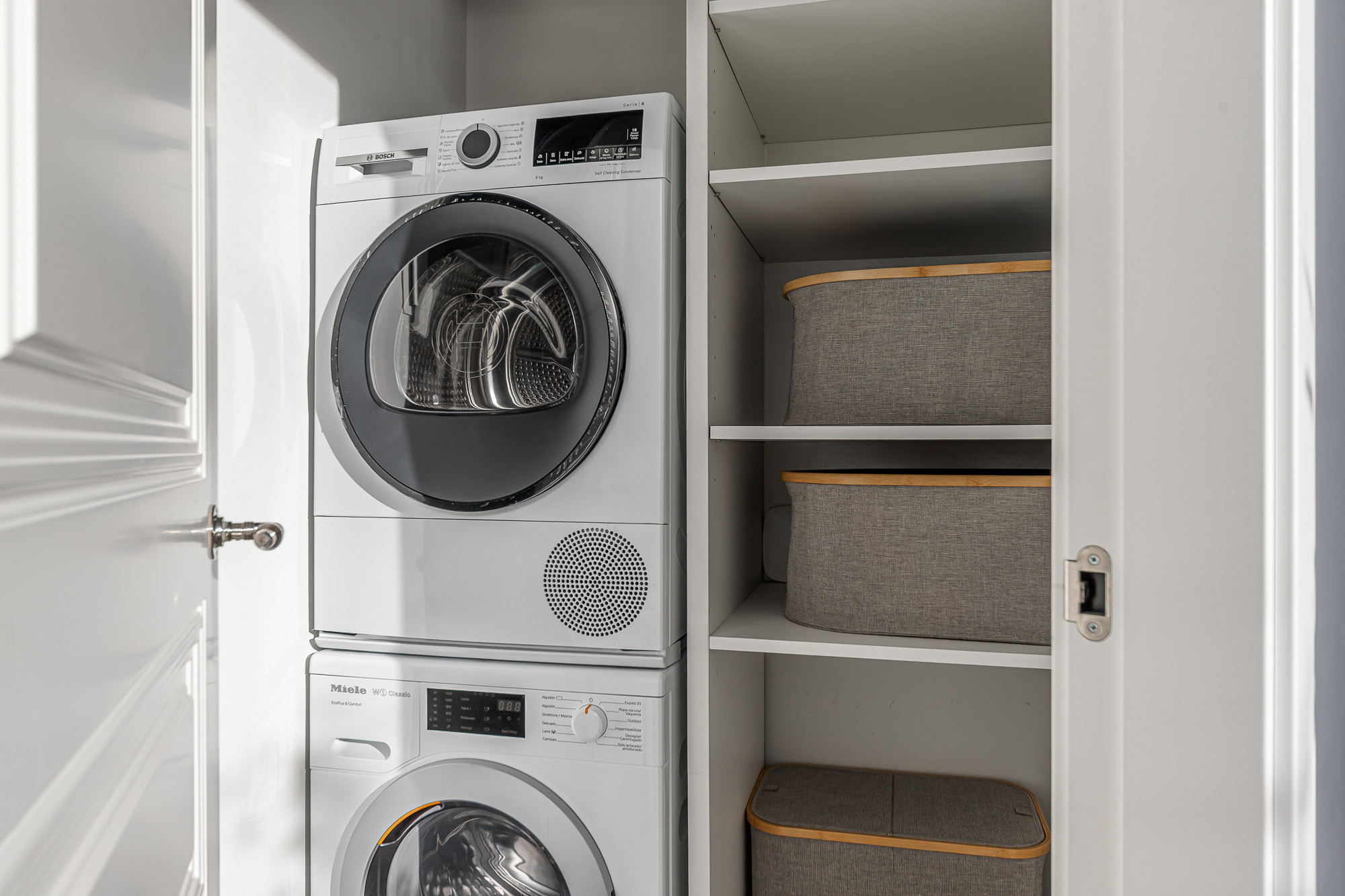 - Un cuarto de lavandería independiente con lavadora y secadora