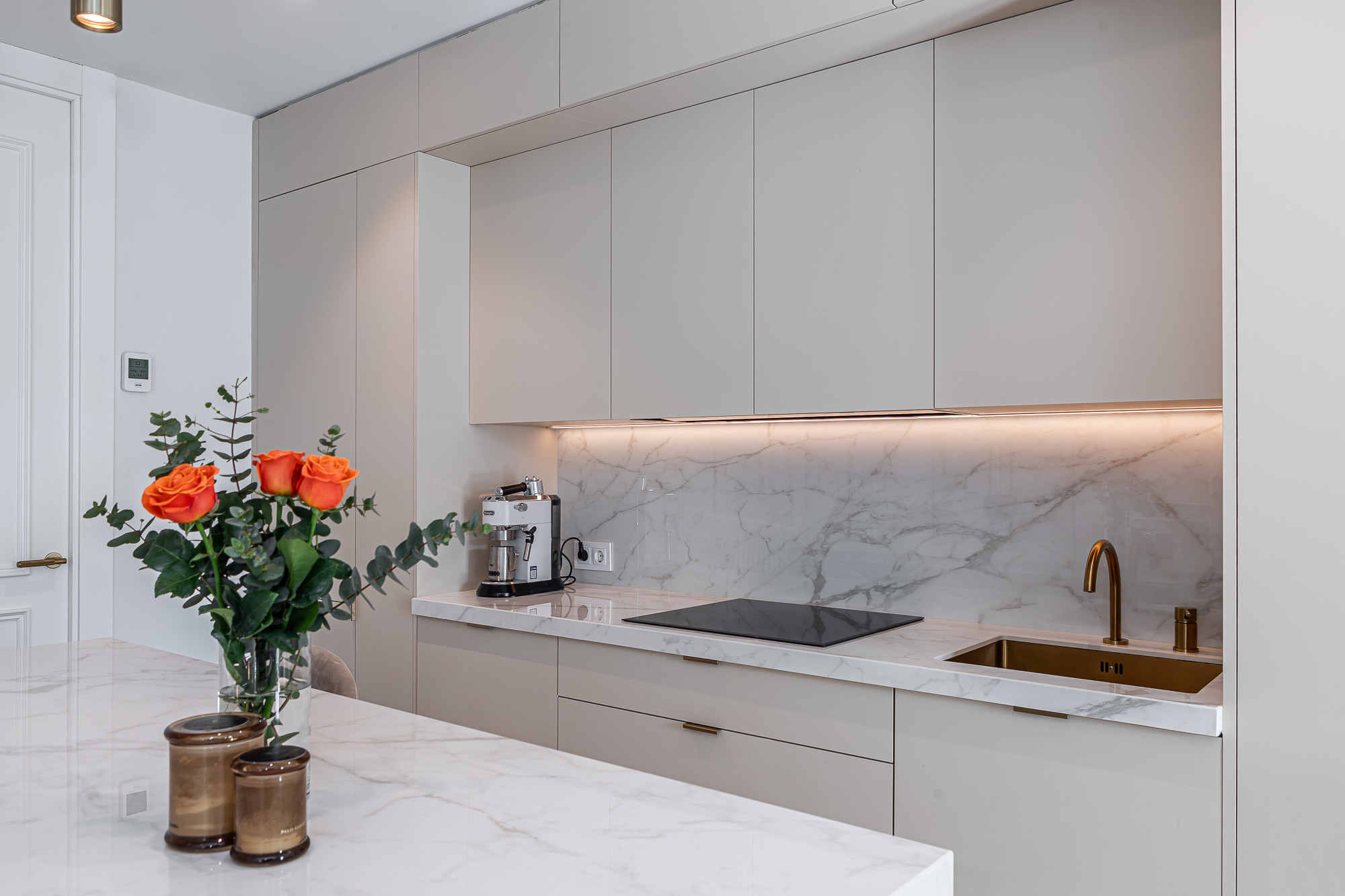 La cocina americana está totalmente equipada con electrodomésticos de última generación, incluyendo nevera, lavadora, horno, microondas, cafetera, tostadora, y una amplia variedad de menaje. Ideal para preparar deliciosas comidas durante tu estancia.