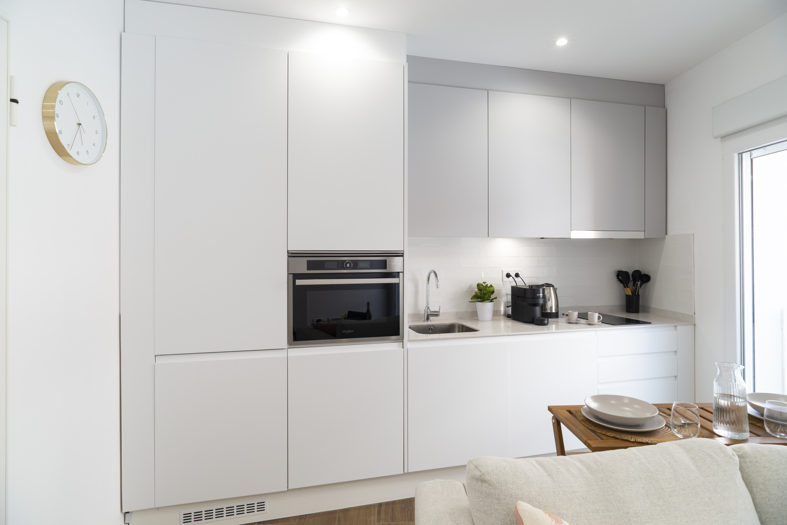 La cocina americana está totalmente equipada con electrodomésticos de última generación, incluyendo nevera, lavadora, lavavajillas, horno, microondas, cafetera, tostadora, hervidor, exprimidor y menaje completo. Podrás preparar tus comidas con total comodidad.