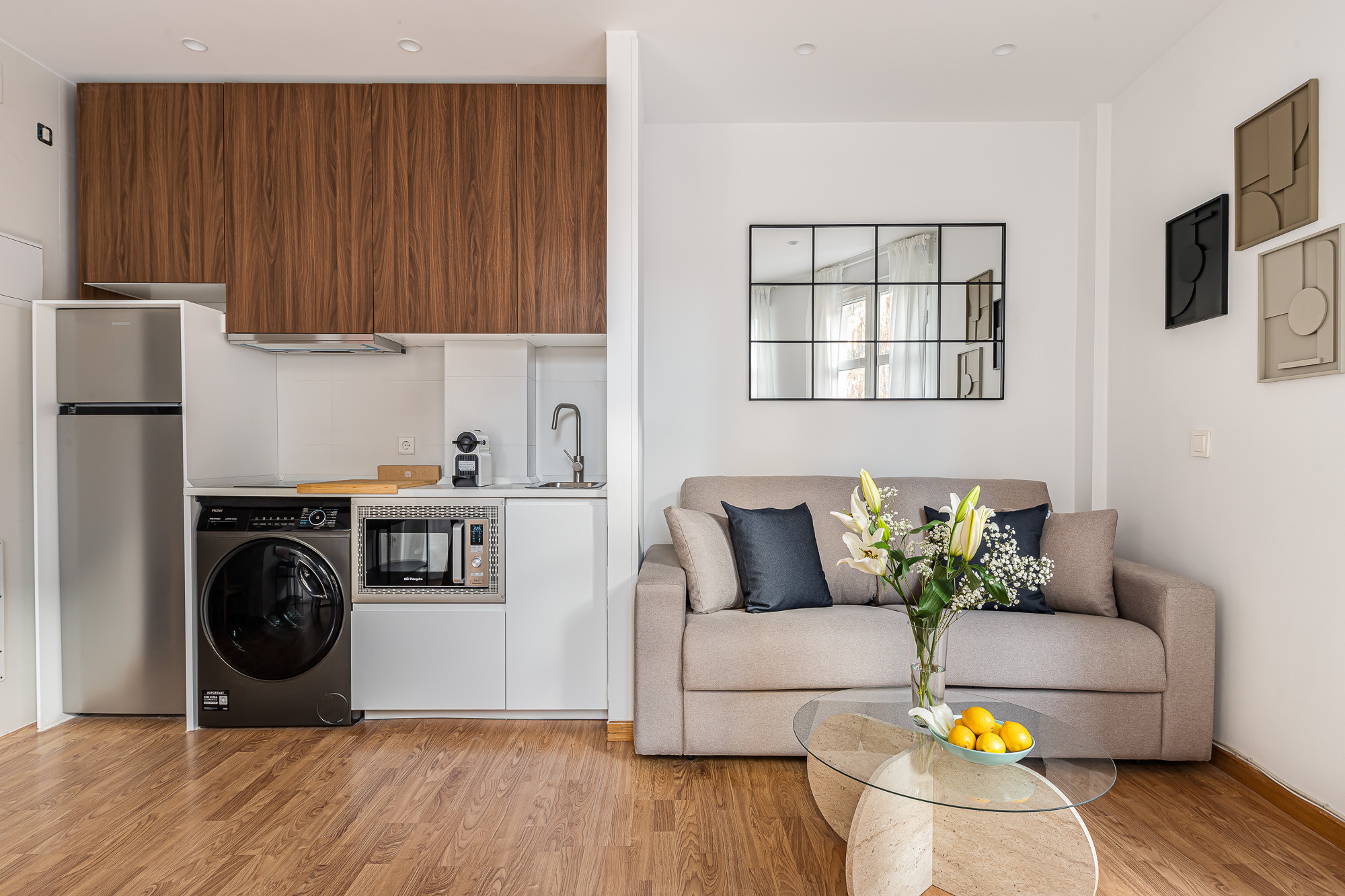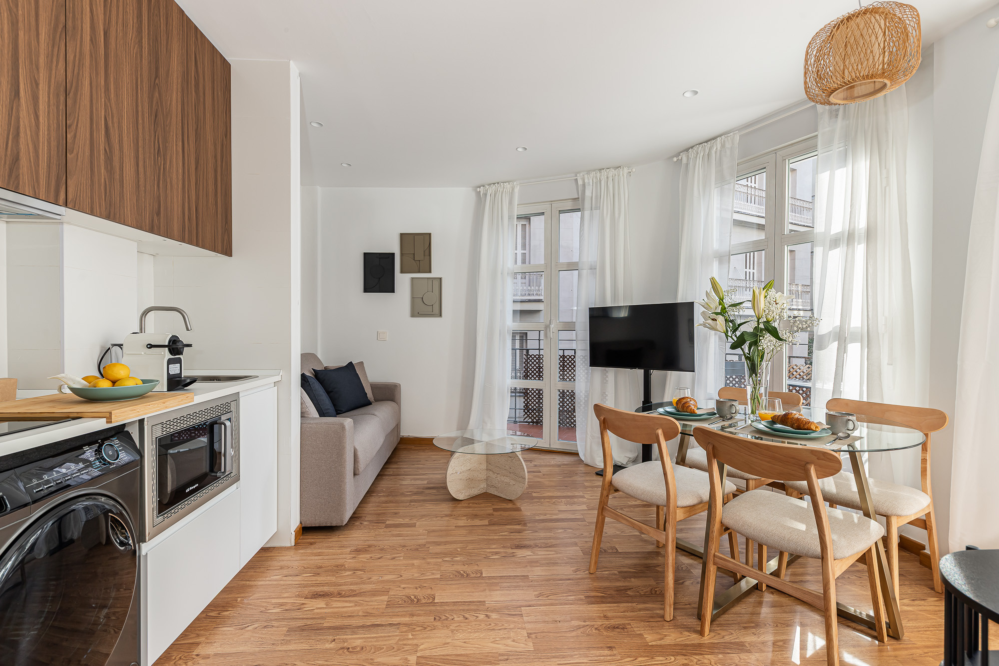 La cocina americana está completamente equipada con electrodomésticos de última generación: nevera, lavadora, lavavajillas, microondas, cafetera, tostadora, hervidor, exprimidor y menaje completo. Ideal para preparar tus propias comidas durante la estancia.