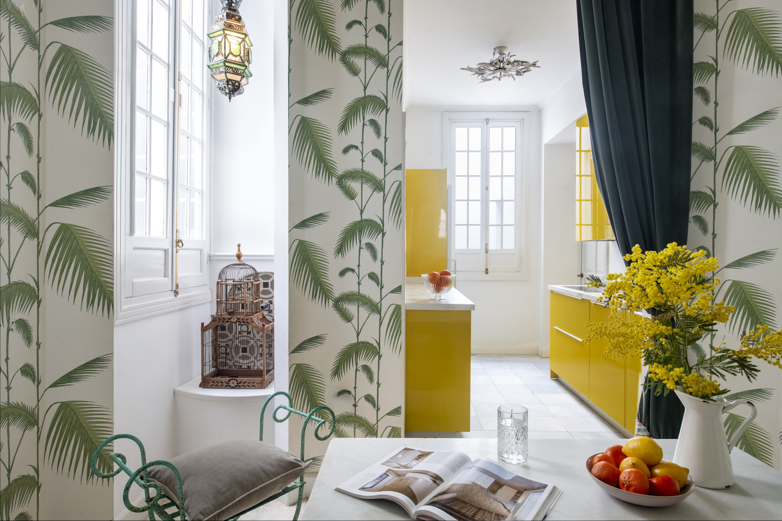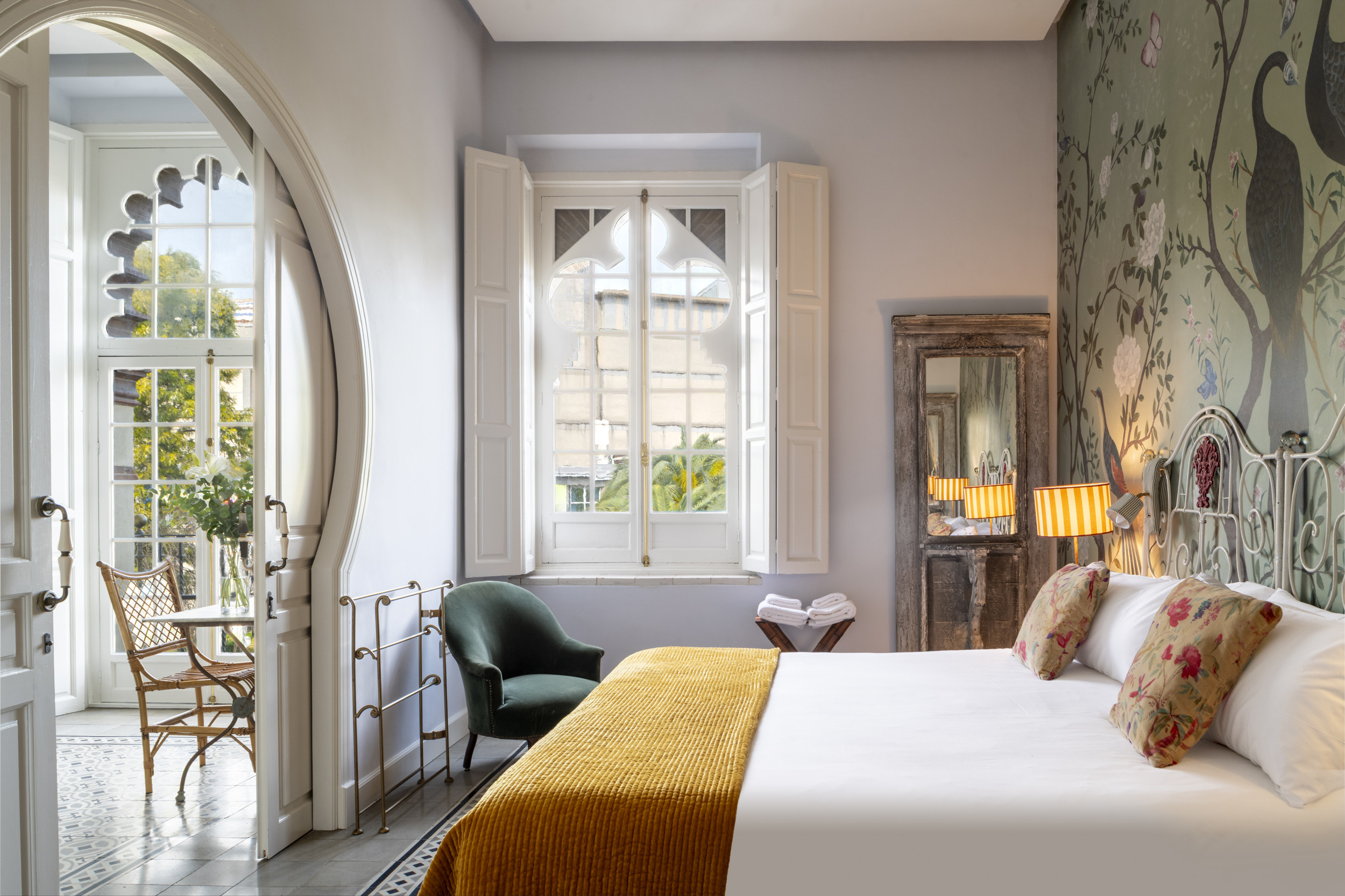 El salón es una auténtica joya: luminoso, elegante y con ese aire señorial que transforma la estancia en experiencia. Desde su balcón se contemplan las vistas al Jardín de la Caridad, un rincón verde con palmeras perfecto para pasear y desconectar. La cocina es independiente y cuenta con zona de comedor, ideal para desayunos tranquilos antes de salir a descubrir la ciudad o para cenas sin prisas al volver.