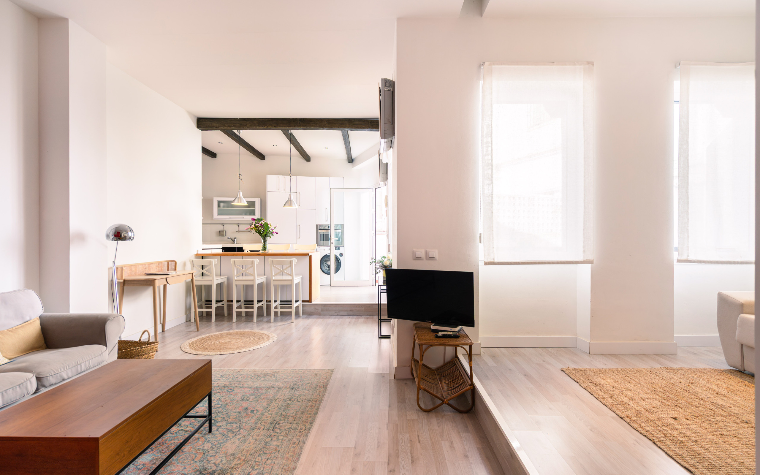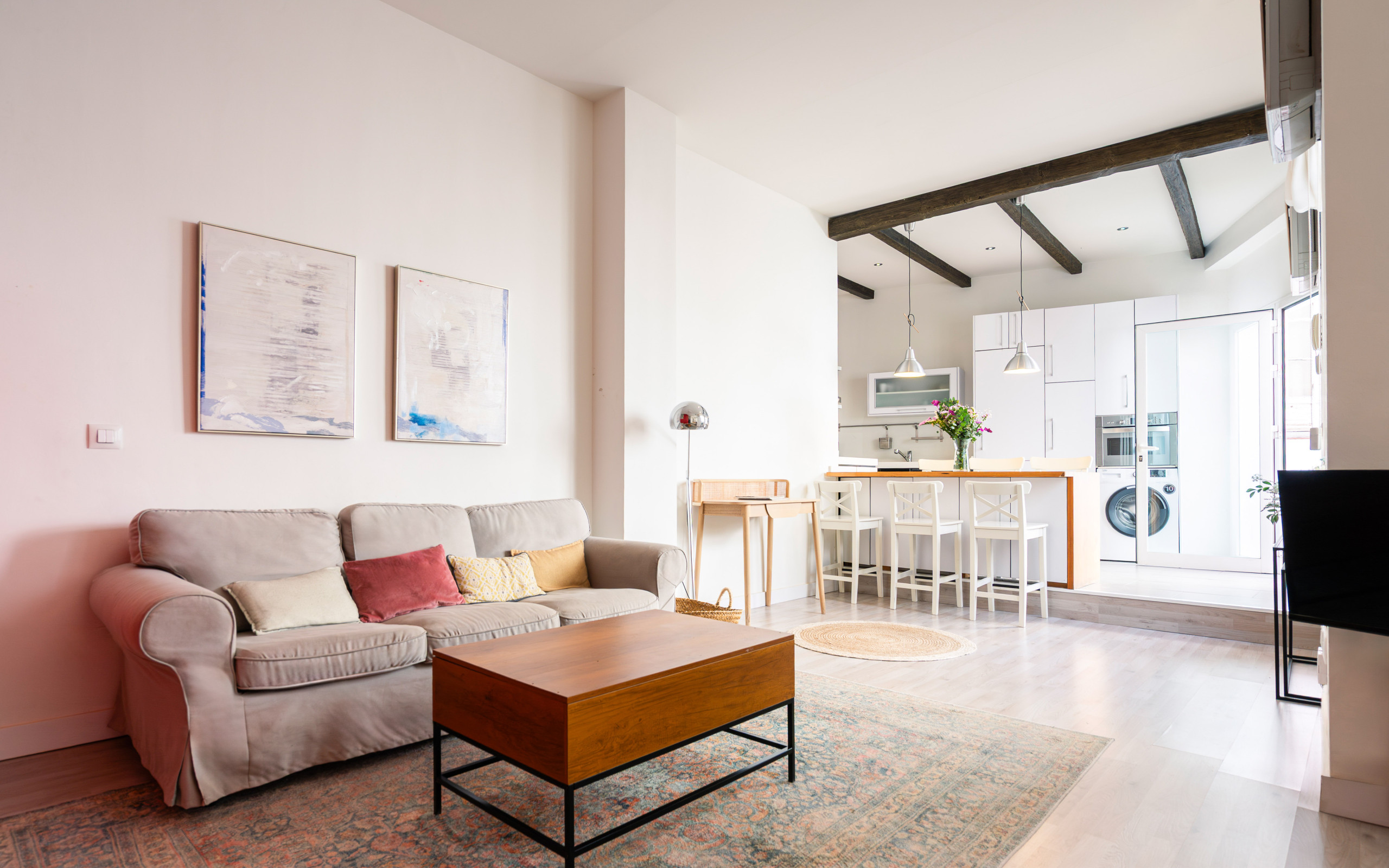 El salón con cocina abierta es una auténtica joya: luminoso, elegante y con ese aire de diseño que transforma la estancia en toda una experiencia.