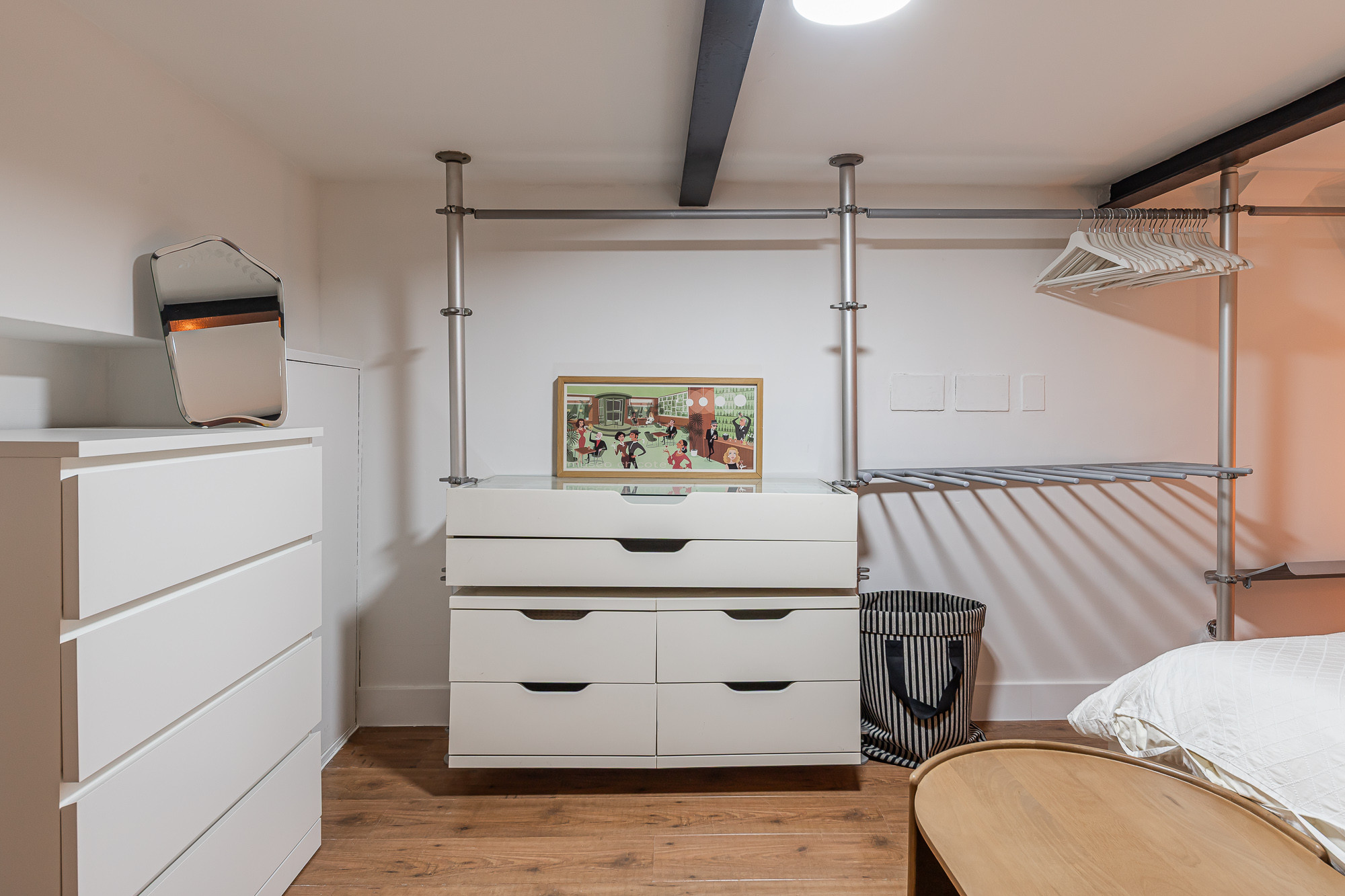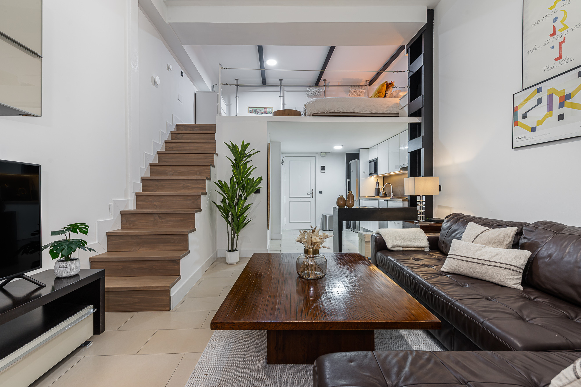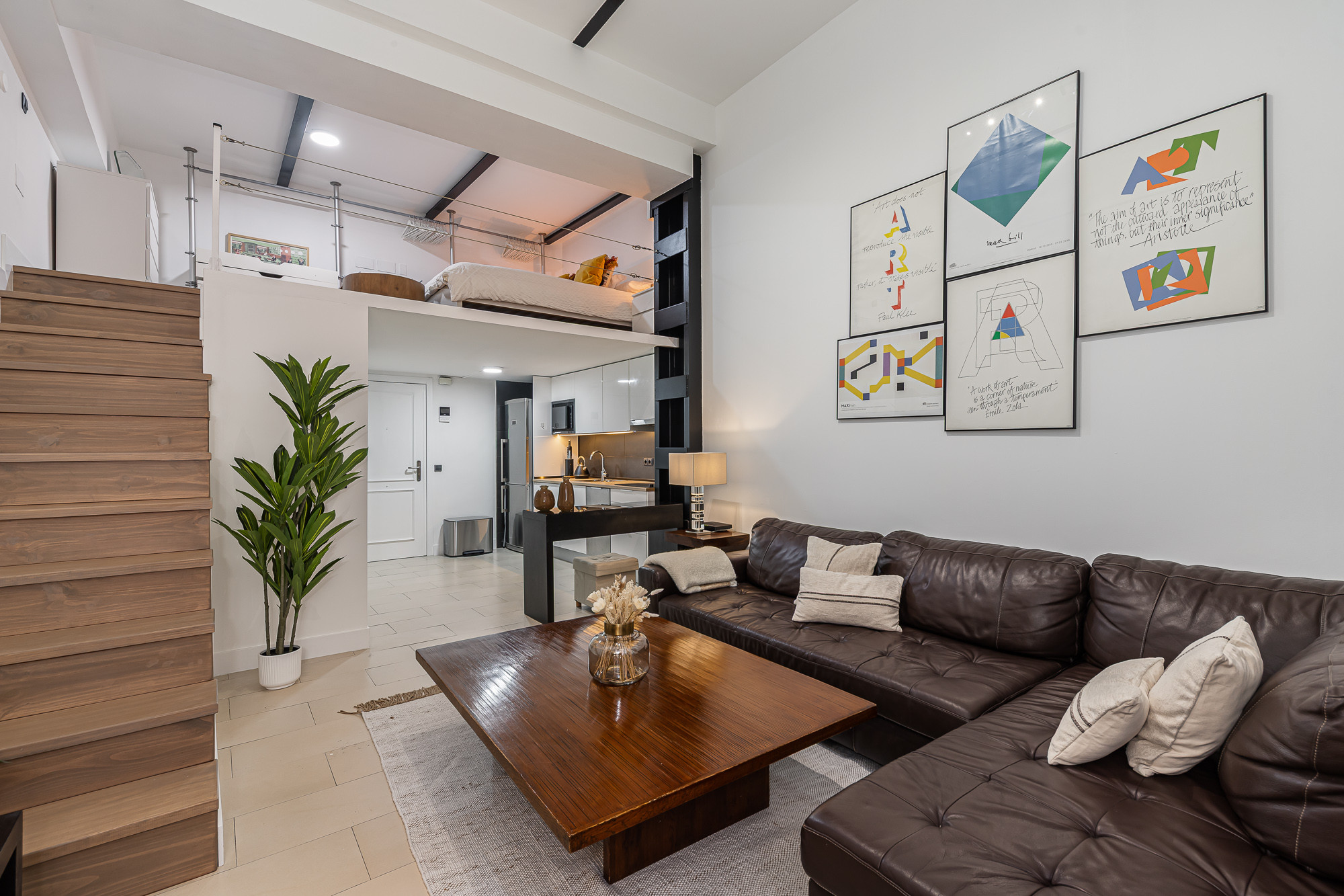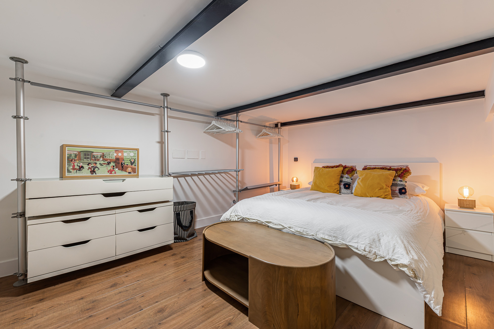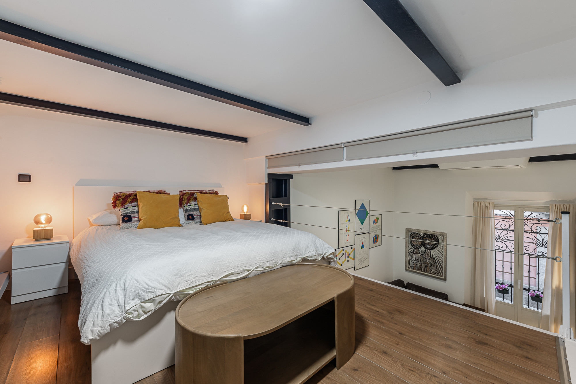 A bright, open loft-style bedroom with a double bed, generous storage space, and an intimate, relaxing atmosphere. From here, you can appreciate the full sense of space thanks to the height of the ceilings and the open-concept design.