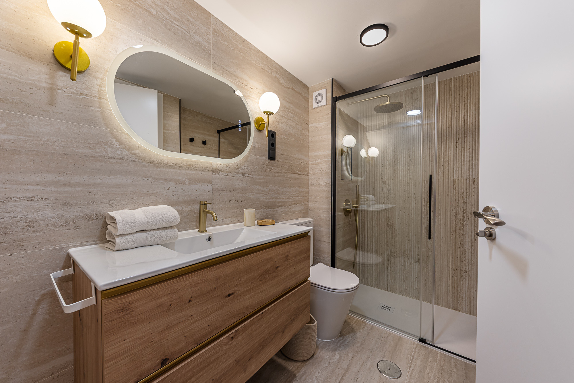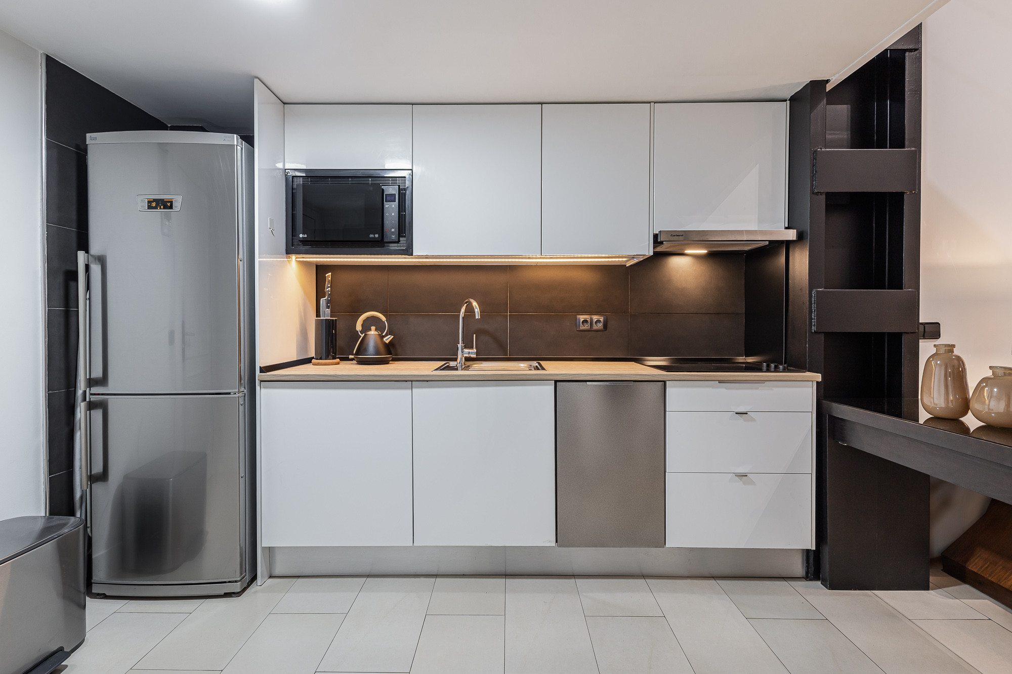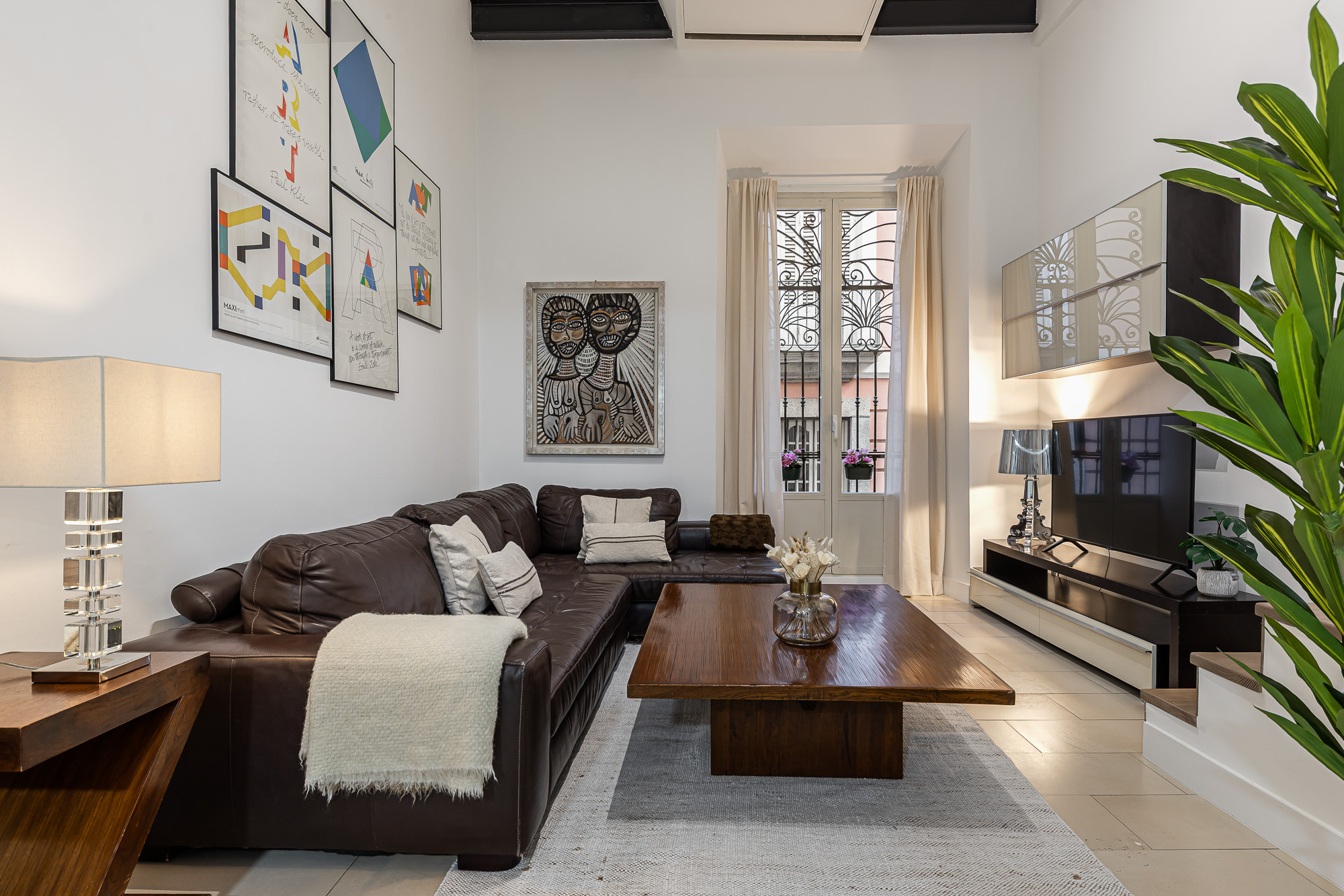 A cozy living room with high ceilings, a leather chaise-longue sofa, warm lighting, and carefully selected decorative details. The fully equipped kitchen offers everything needed for both short and extended stays. This level also features a renovated bathroom with a spacious shower and high-quality finishes.