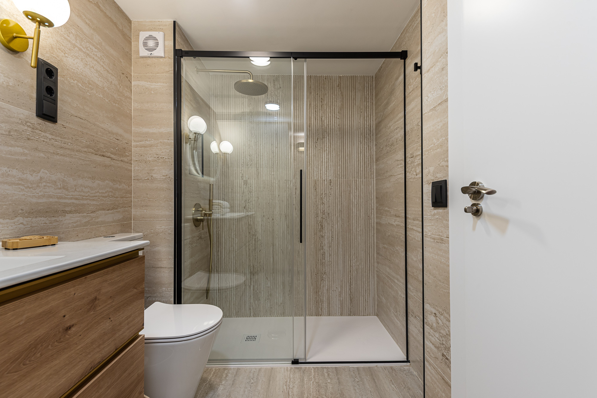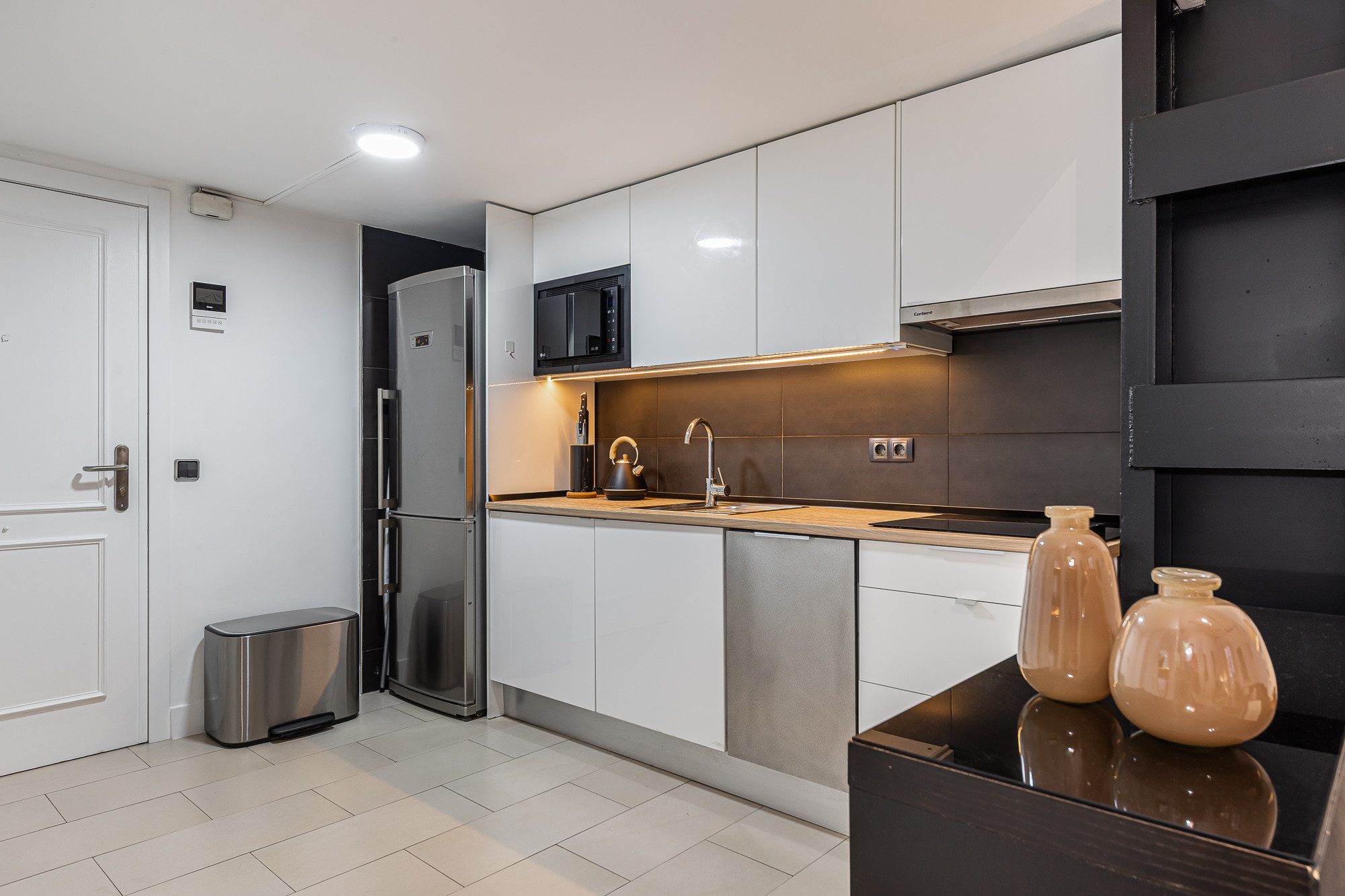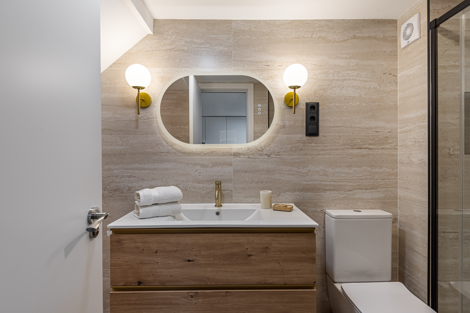 A cozy living room with high ceilings, a leather chaise-longue sofa, warm lighting, and carefully selected decorative details. The fully equipped kitchen offers everything needed for both short and extended stays. This level also features a renovated bathroom with a spacious shower and high-quality finishes.