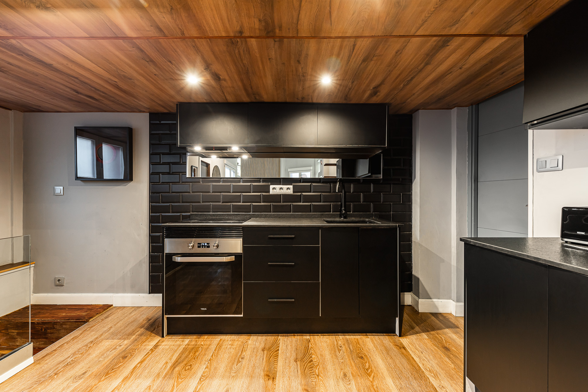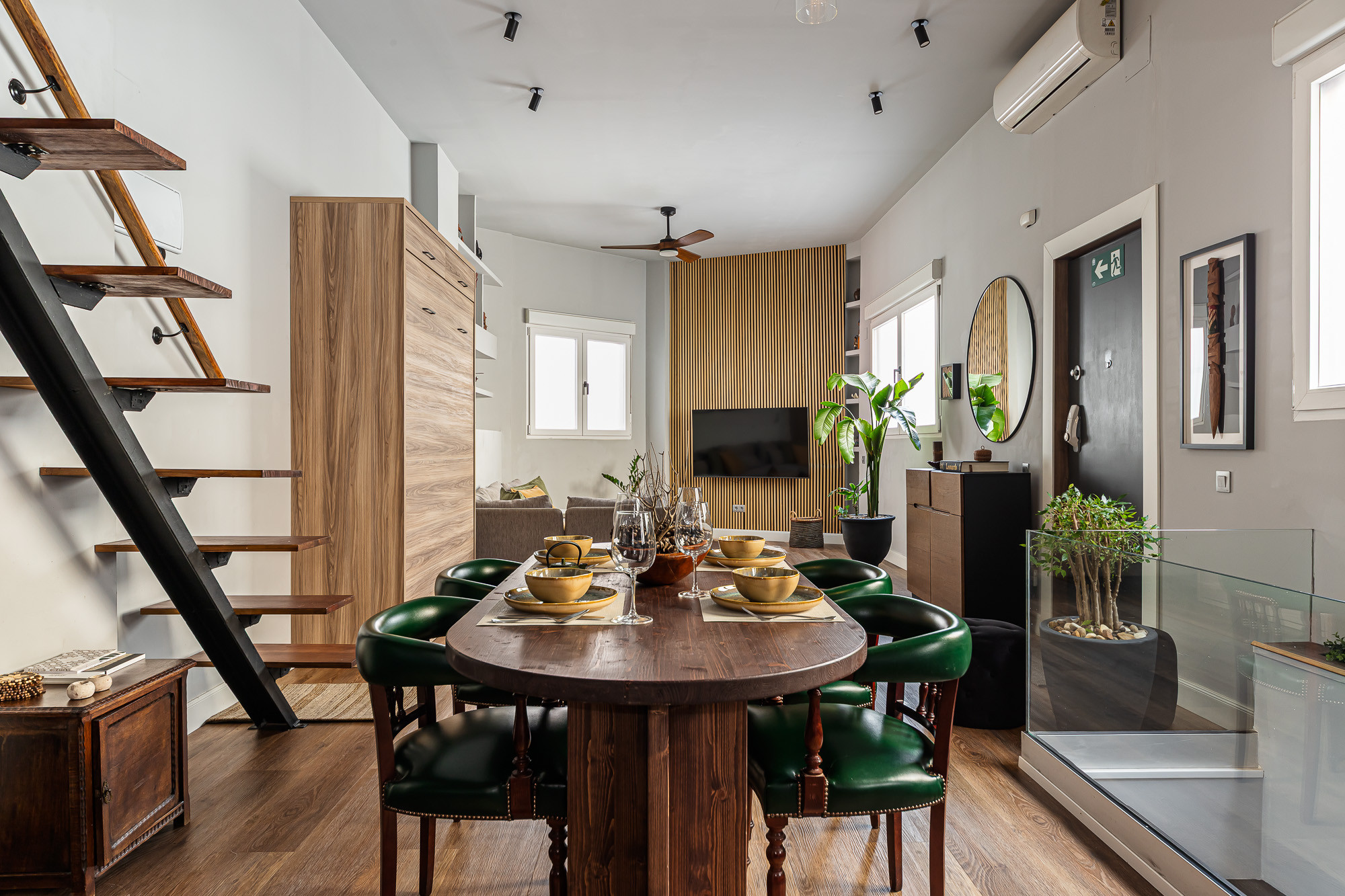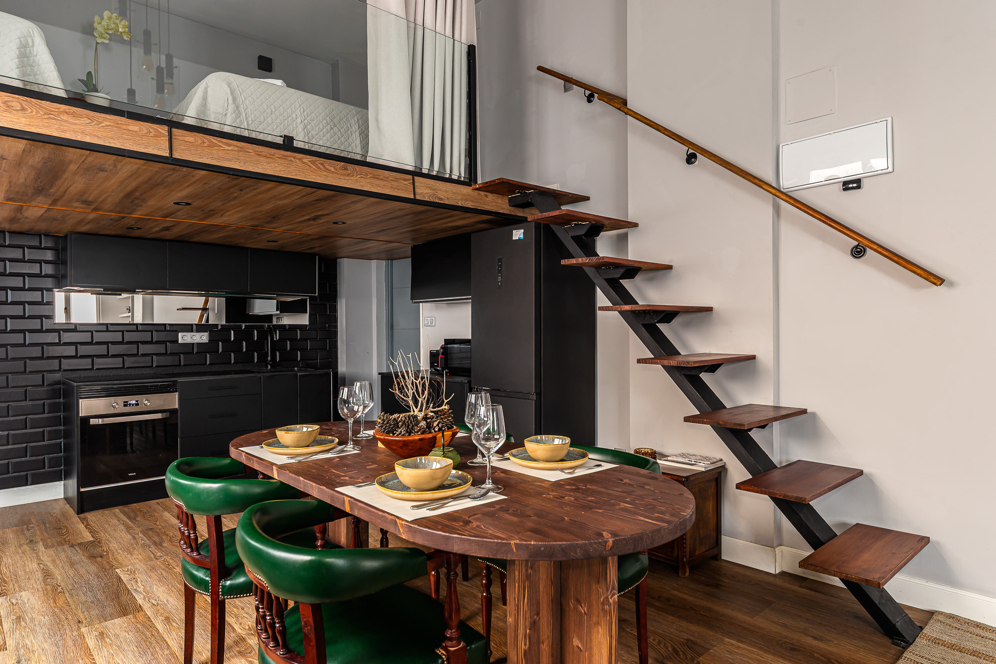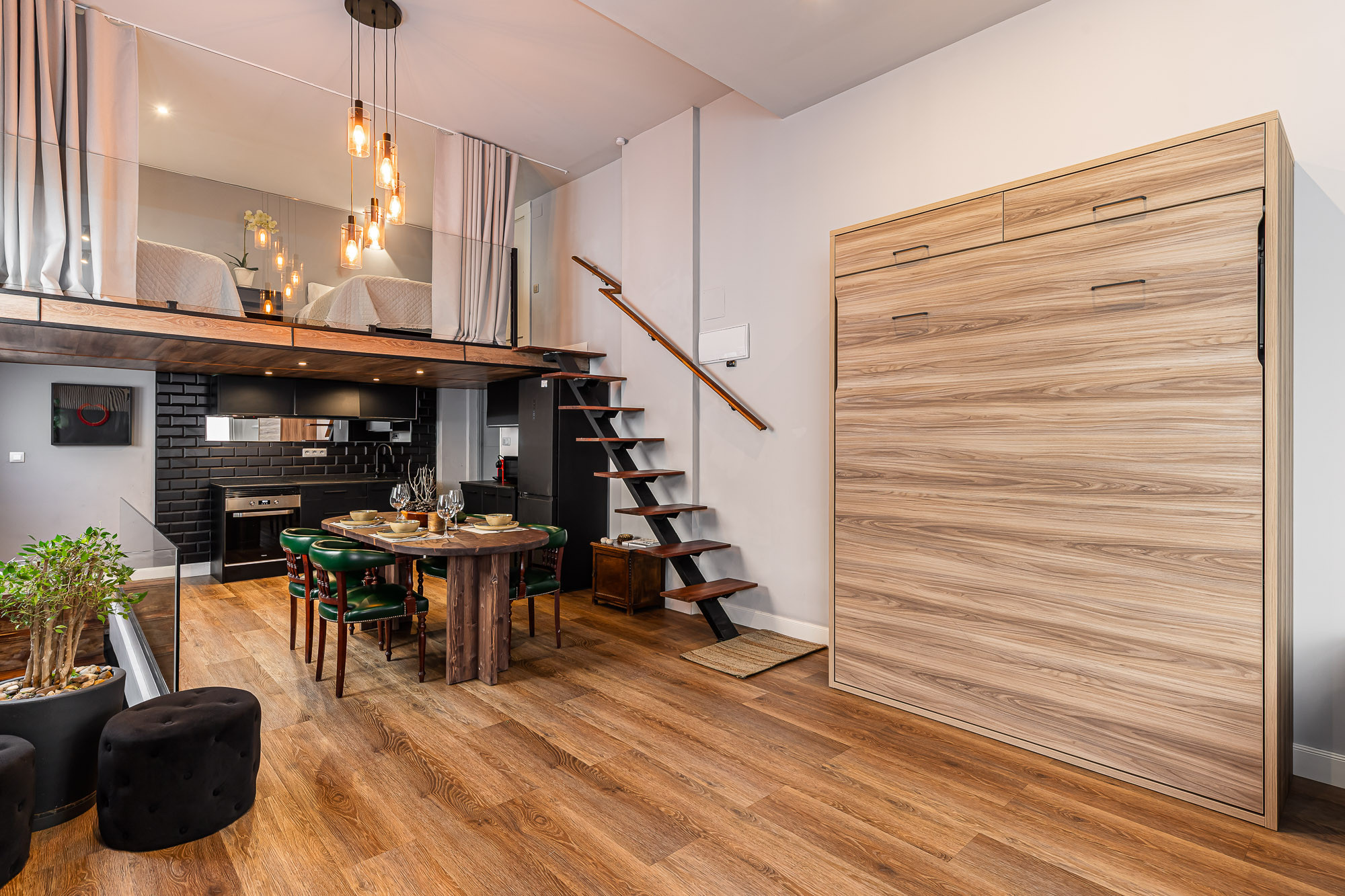 On the main floor (entrance level) you will find an open-plan living area with lounge, dining space, fully equipped kitchen and a complete bathroom. In this same area there is a wall bed with a double mattress, integrated into the living space. Above this level, an open mezzanine with two single beds forms part of the loft concept.