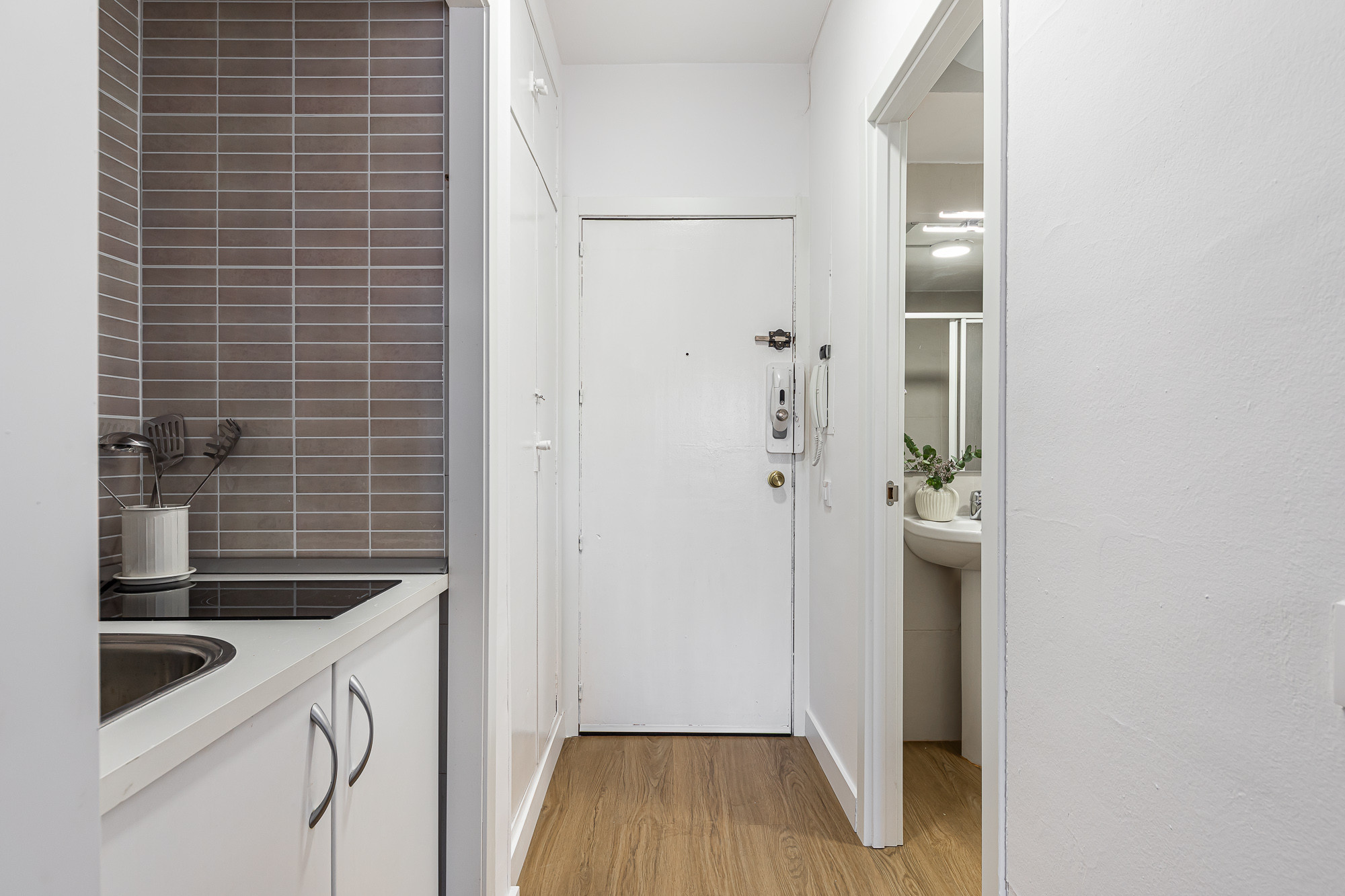 There is a practical kitchenette equipped with the essentials for preparing simple meals during your stay. The bathroom is functional and well maintained, offering everything you need for a comfortable visit.