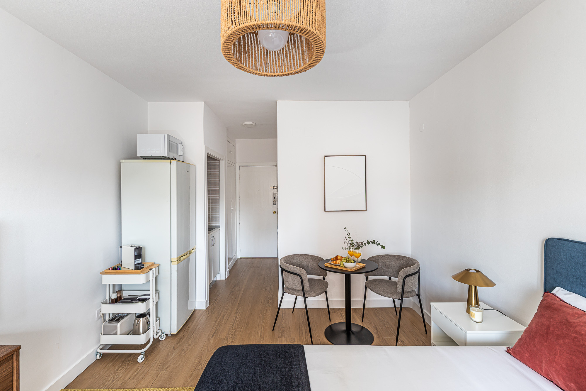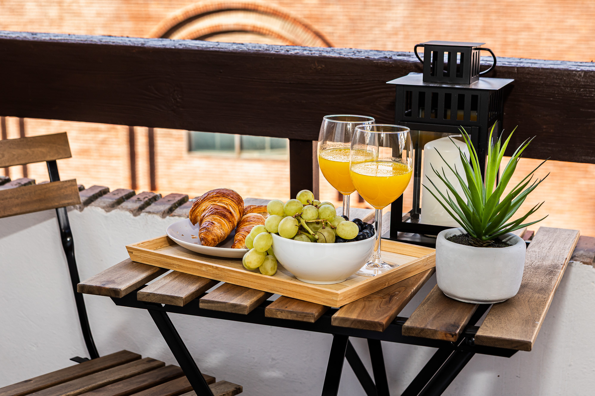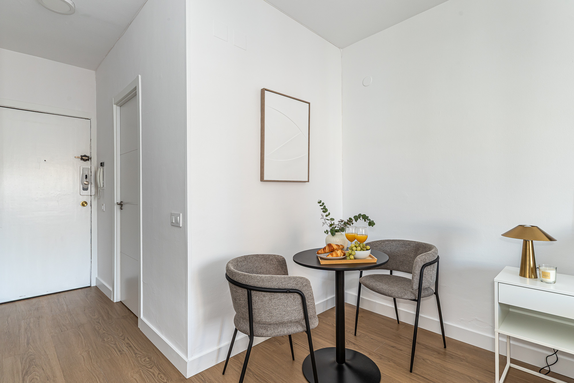 The studio features a comfortable bed, thoughtful décor, and a small dining area ideal for two. The terrace is one of its highlights, perfect for enjoying Seville’s weather or having breakfast outdoors.