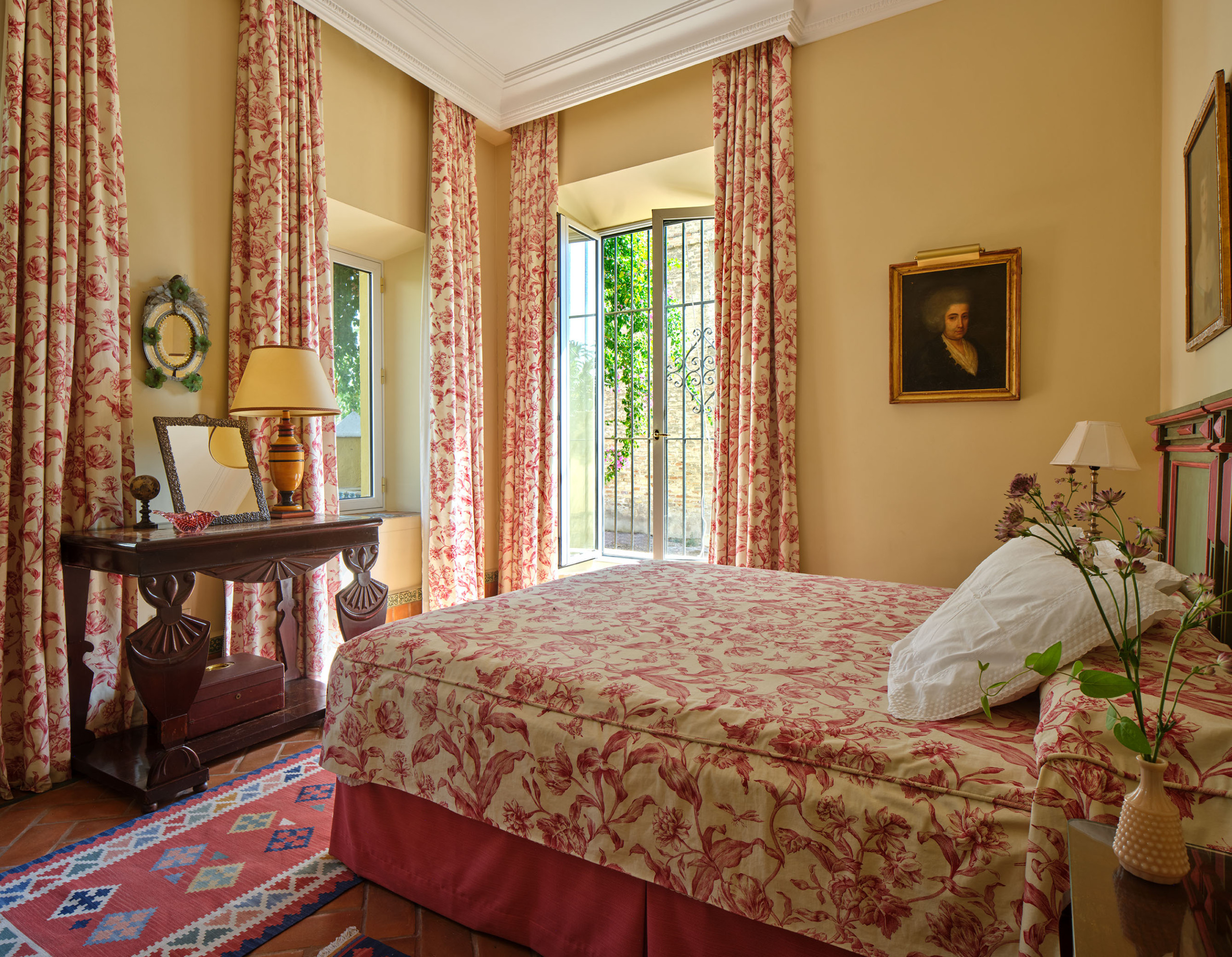 The rooms offer a variety of settings: some open onto the lush Andalusian courtyard, several with balconies; others face the ancient wall of the Royal Alcázar; and a few enjoy views of the Alcázar Gardens, so close that their light and greenery seem to enter the house.
