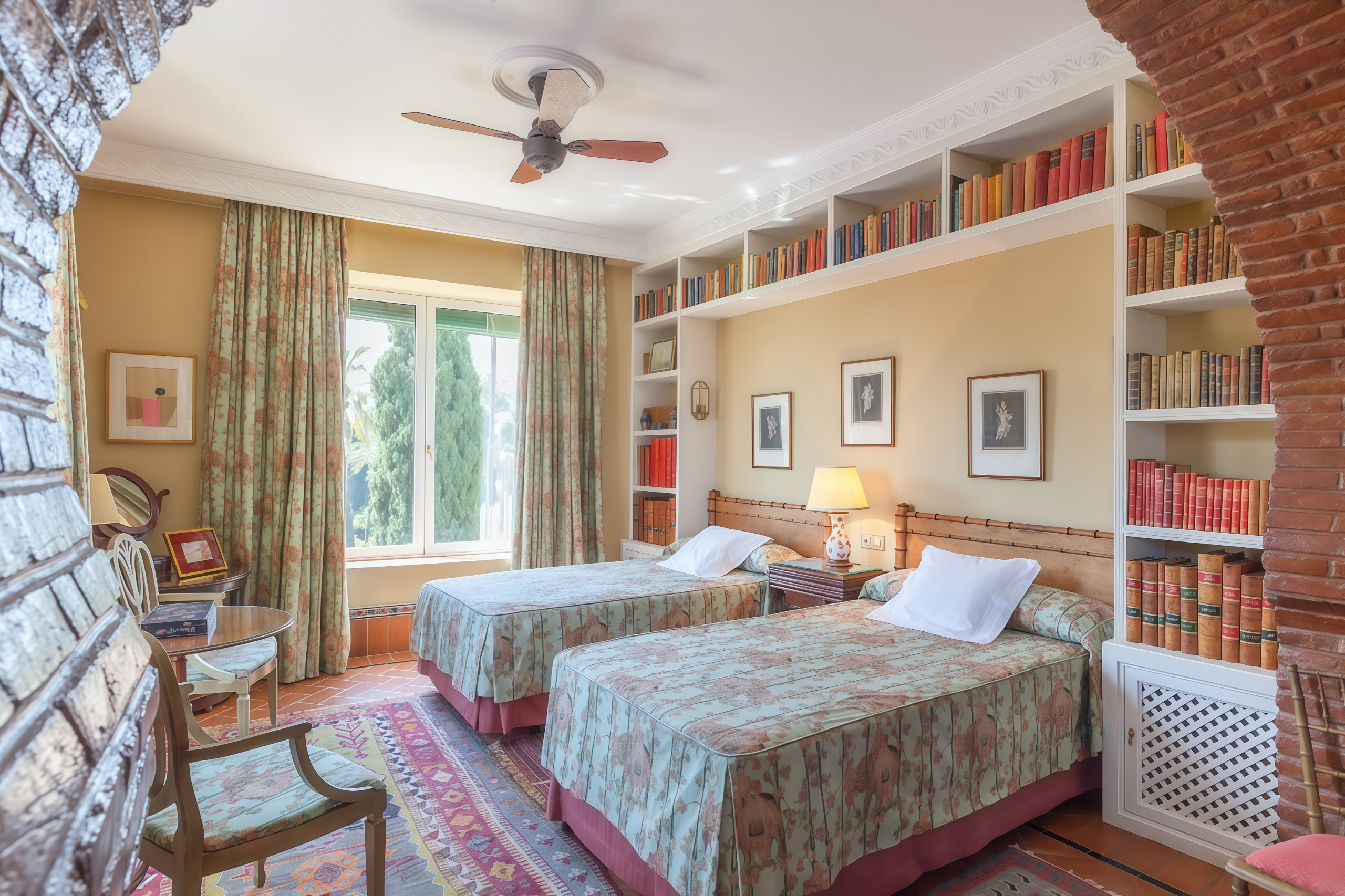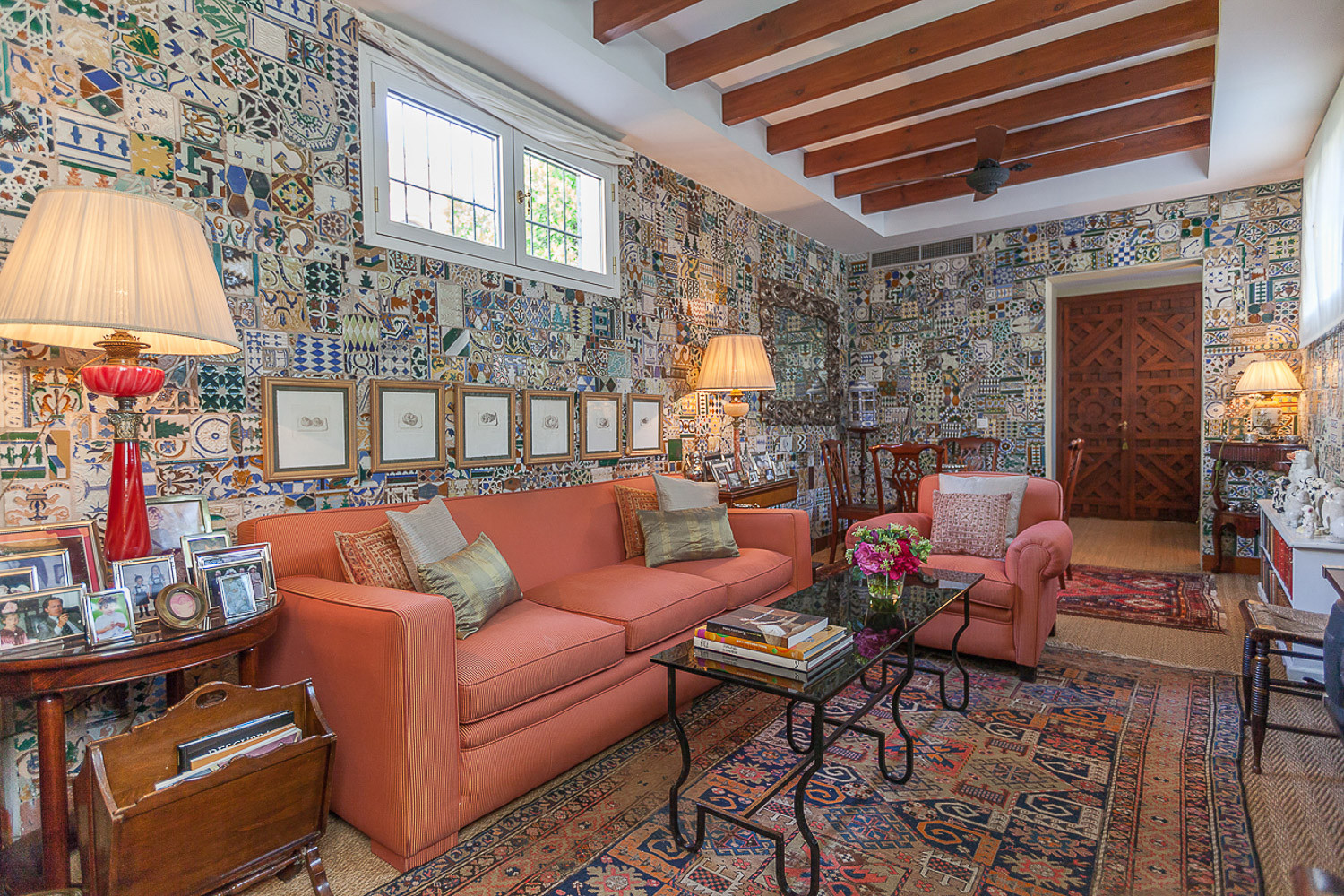 The "Concha Room", located on the third floor of the palace, is a bright and elegant space where classic Sevillian charm meets contemporary comfort. Its refined décor and serene atmosphere invite rest and contemplation. From this room, guests enjoy a double outlook: the central Andalusian patio, a gardened oasis of tiles and a fountain, and the Gardens of the Royal Alcázar, so close that their greenery and light seem to drift into the house.