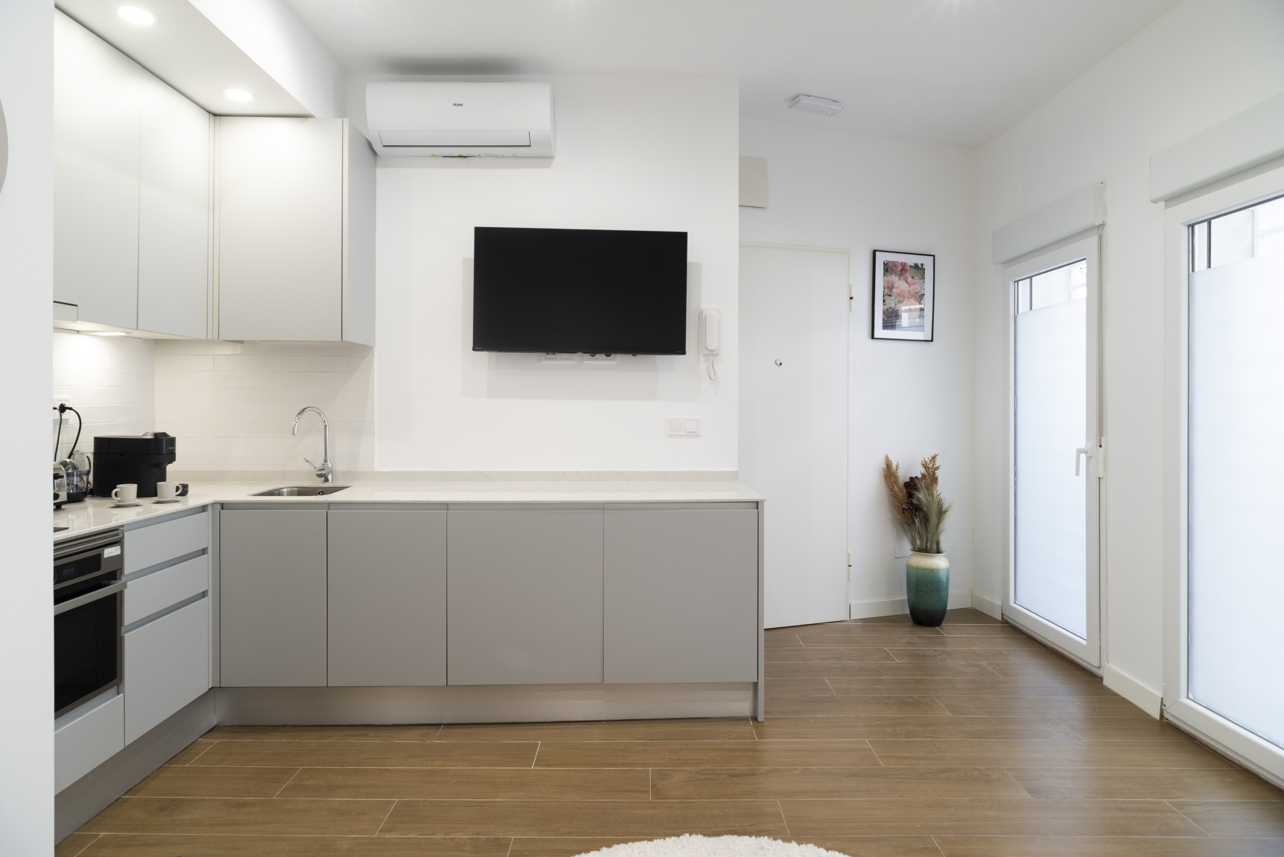 The apartment features a modern fully equipped American kitchen, ideal for preparing quick breakfasts or intimate dinners. It has state-of-the-art appliances such as a washing machine, dryer, dishwasher, oven, microwave, coffee maker, toaster, kettle, and juicer, ensuring all the comforts for a pleasant stay.